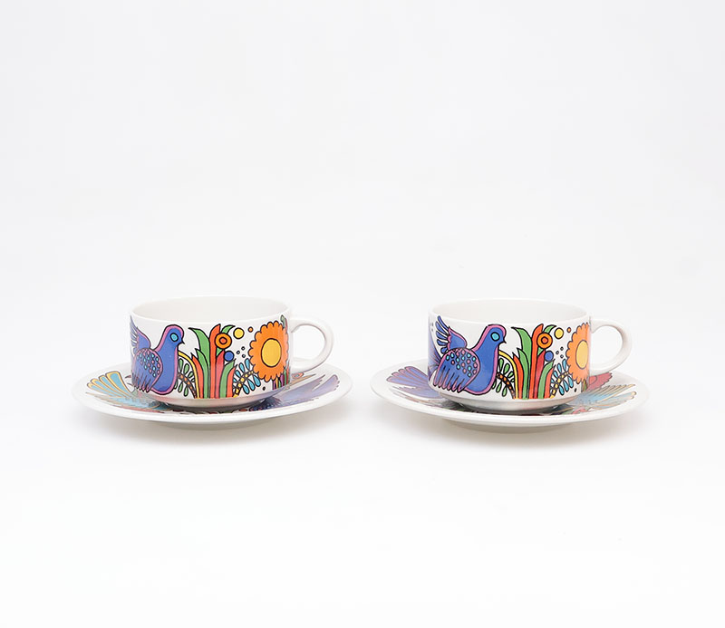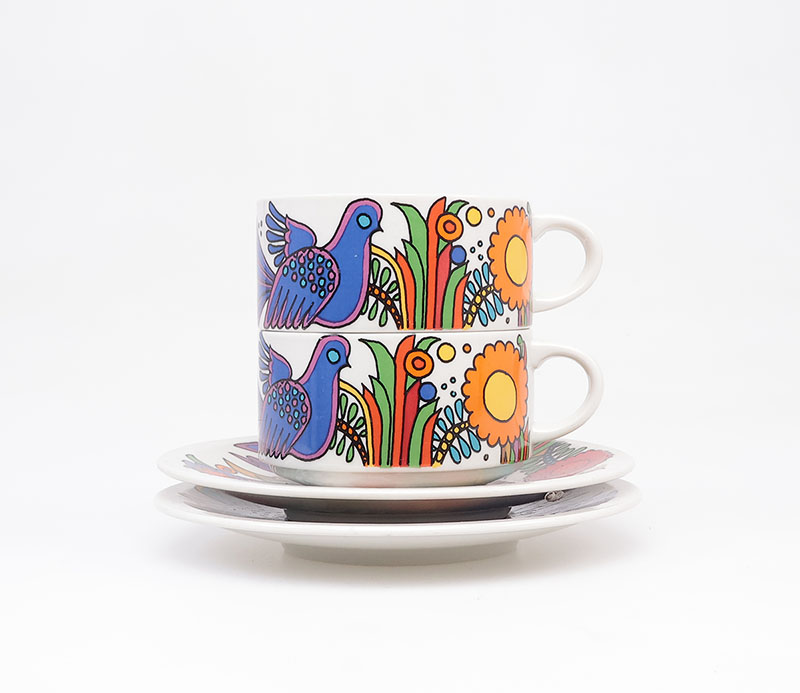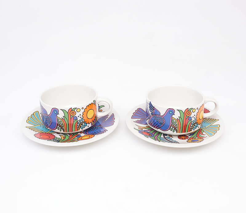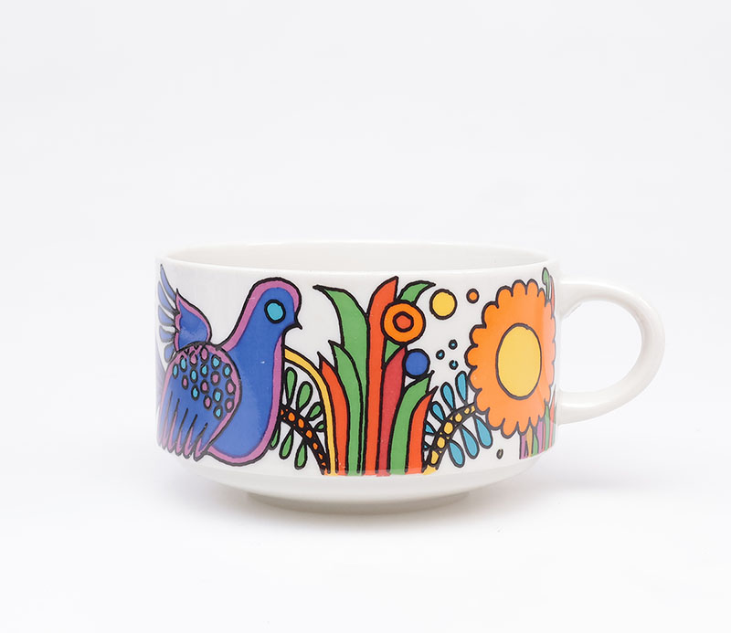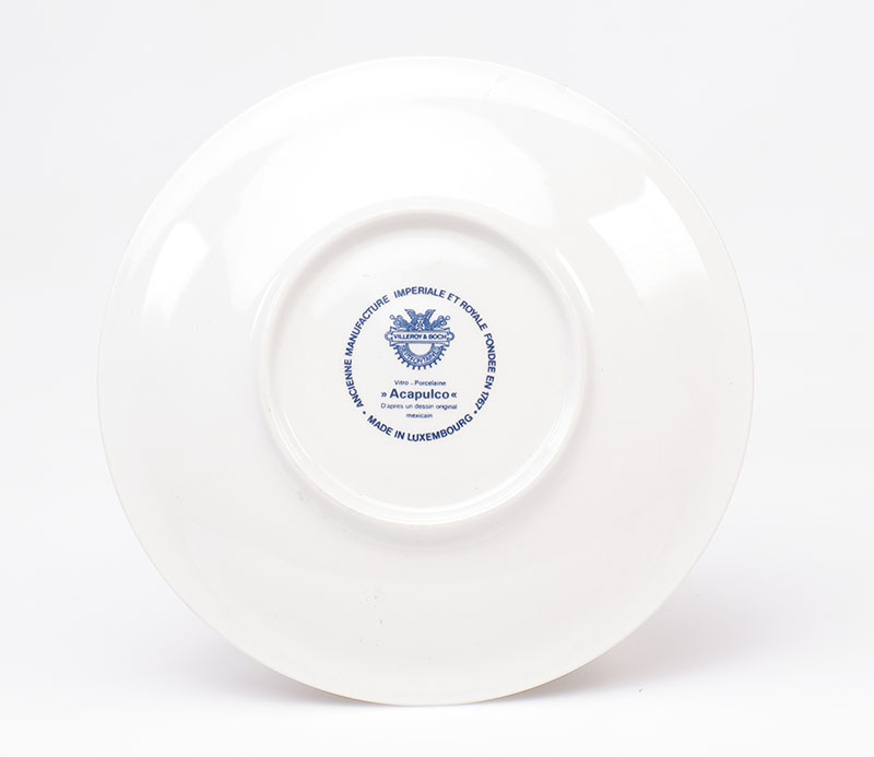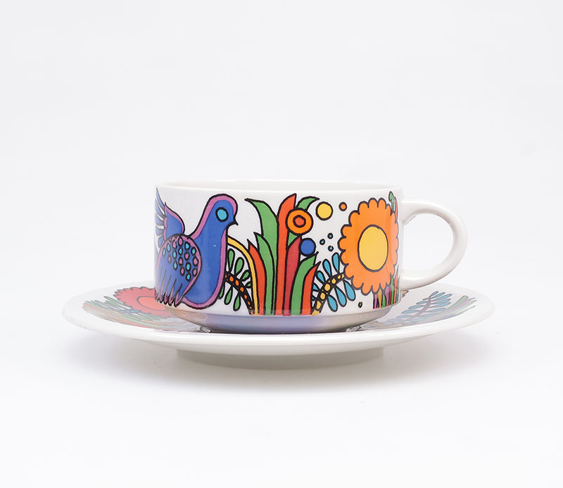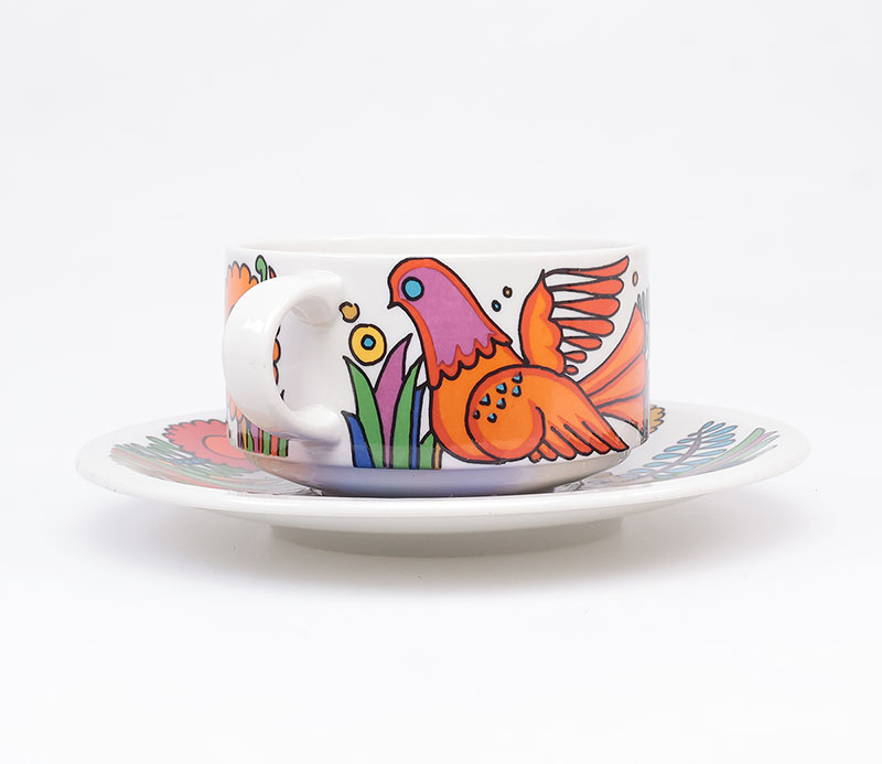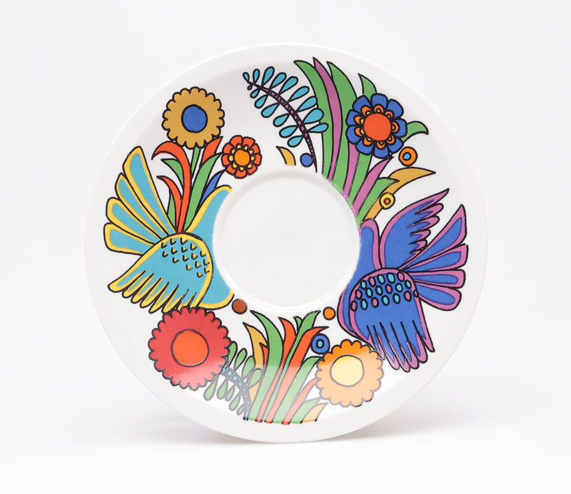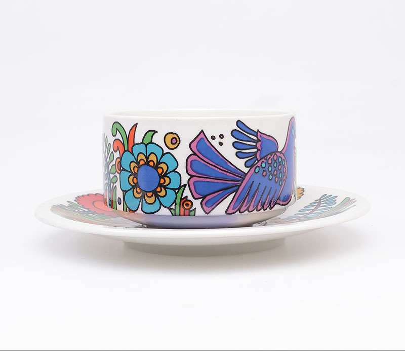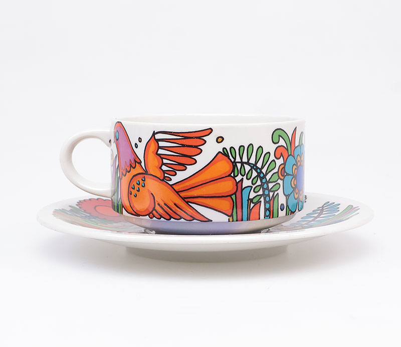 Het porselein heeft een prachtig kleurrijk decor van bloemen en vogels, geinspireerd door de Azteken.