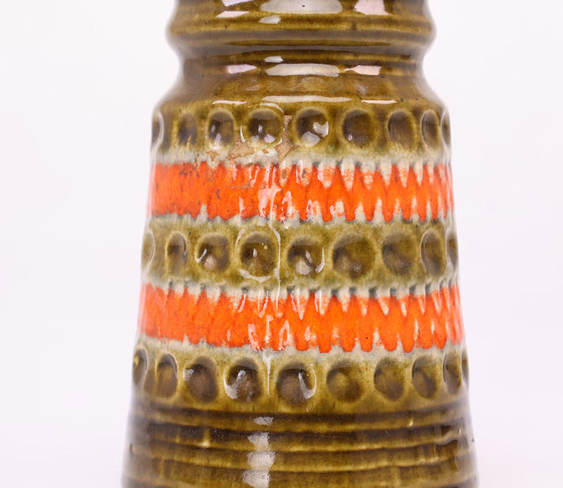 De vaas heeft een relief decor en karakteristiek oranje bruin glazuur, wat zorgt voor een contrastrijk en grafisch geheel.