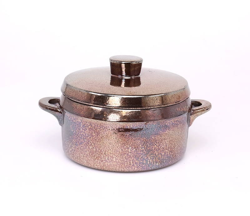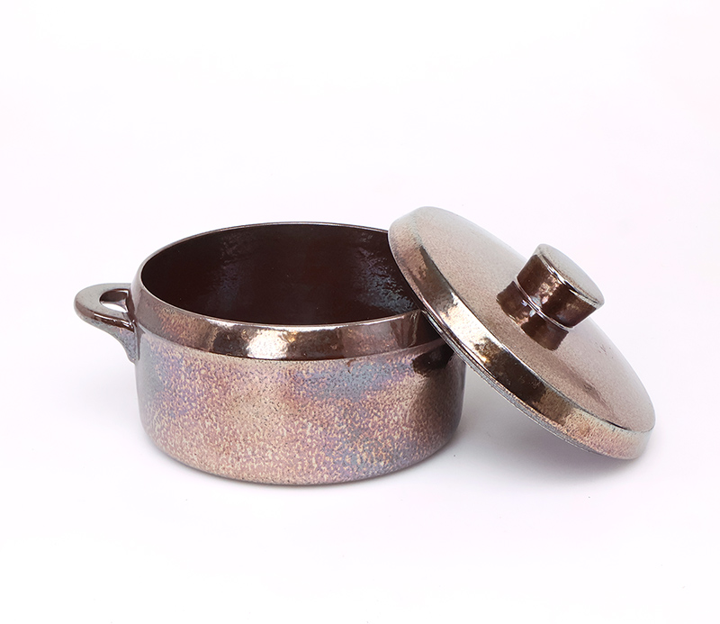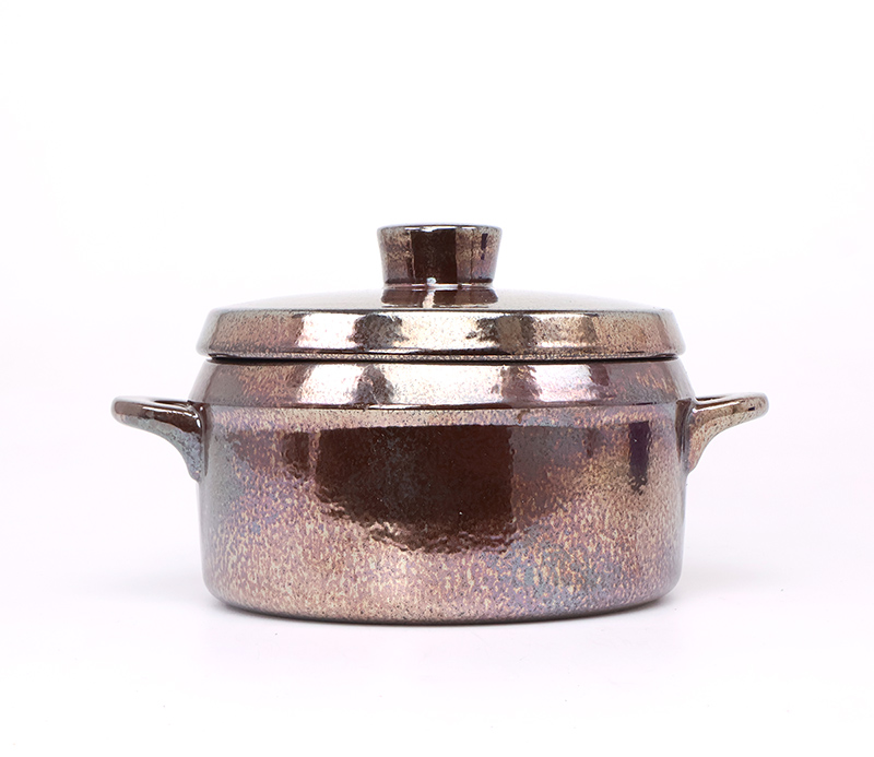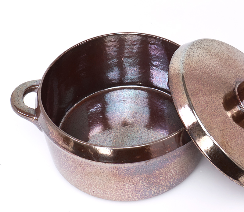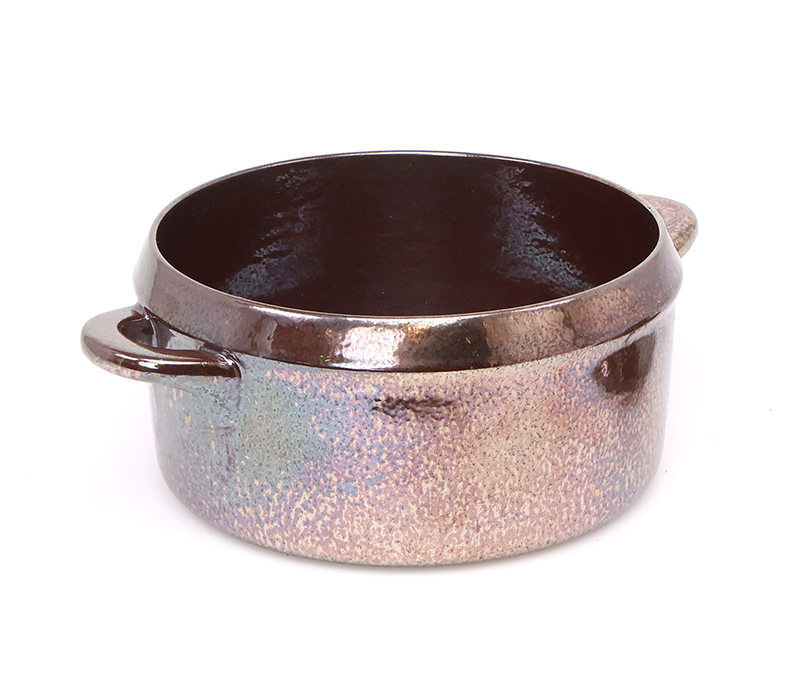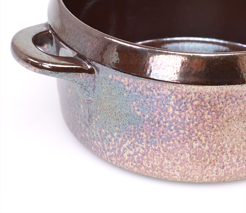 De ovenproof schaal met bijpassende deksel is uitgevoerd in een diep donkerbruin glazuur met een subtiele paars metallic gloed, een echte blikvanger op tafel.