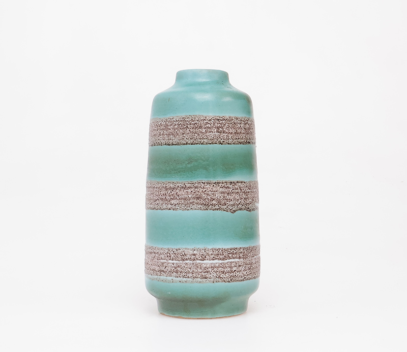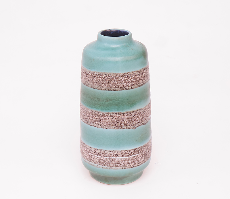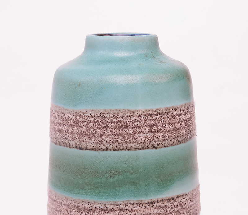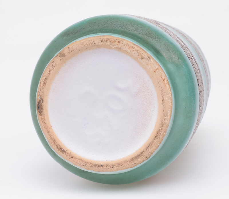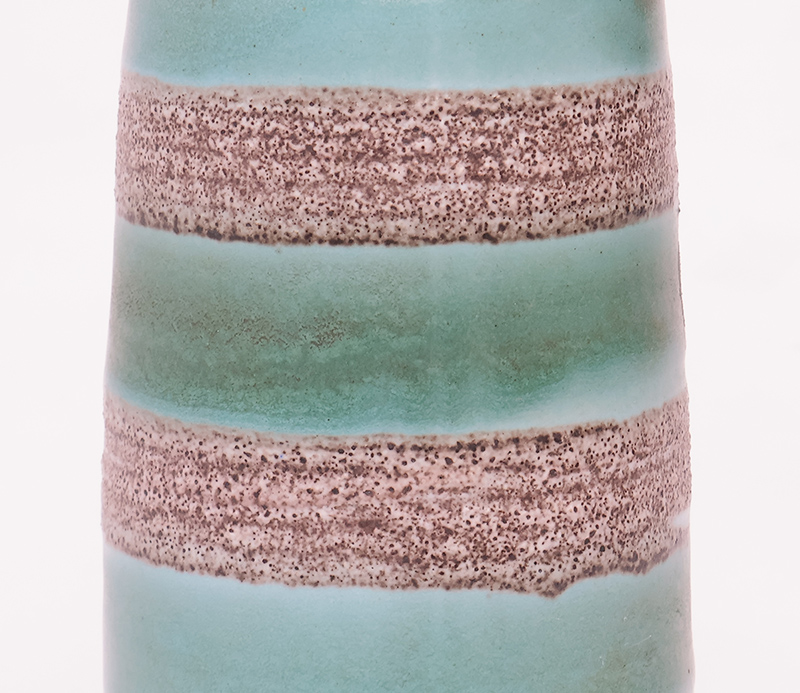Het vaasje is uitgevoerd in aardewerk en geglazuurd in een zachte mintgroene tint met horizontale banden in ruw, gespikkeld beige. De combinatie van het matte en licht glanzende glazuur geeft het object een subtiel gelaagd karakter. De cilindrische vorm met licht versmalde hals zorgt voor een rustige, evenwichtige uitstraling.