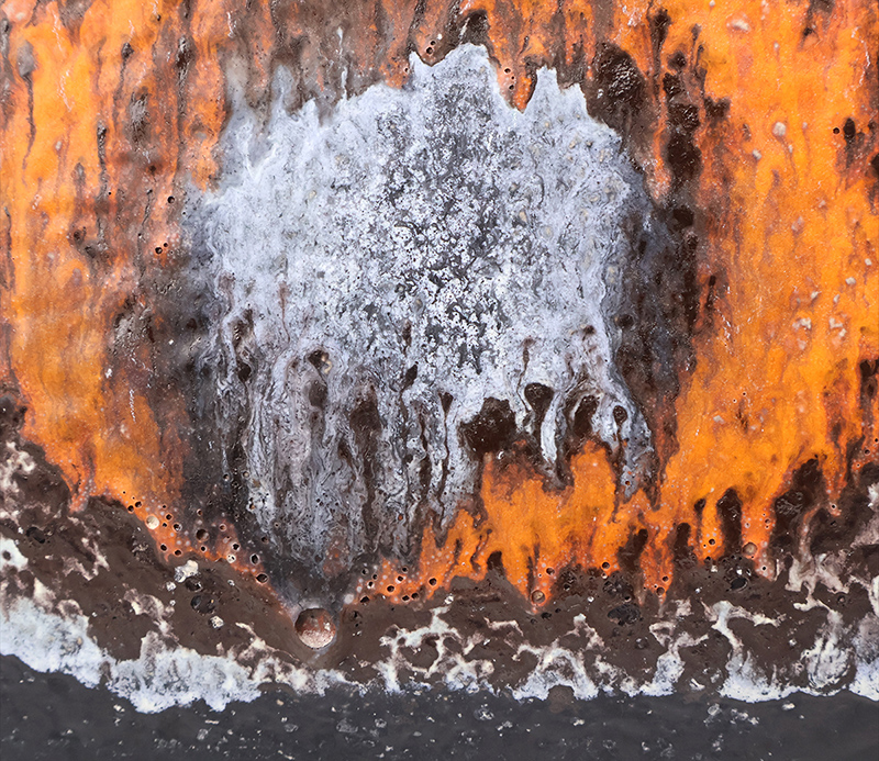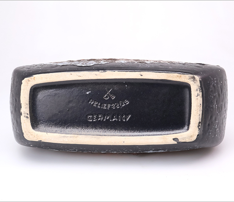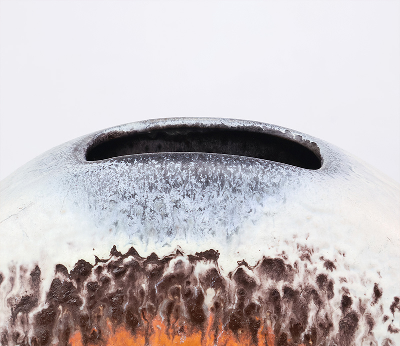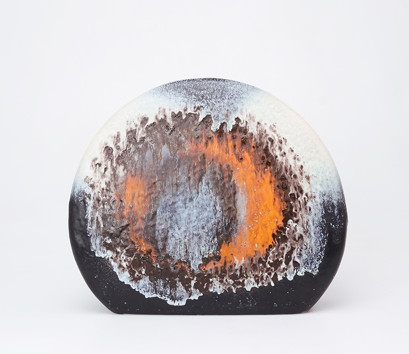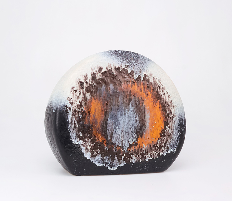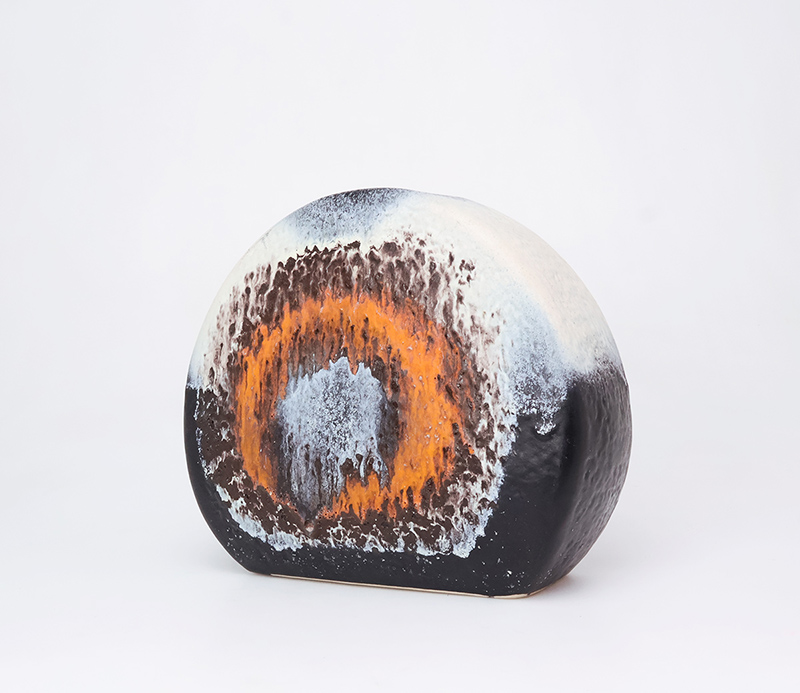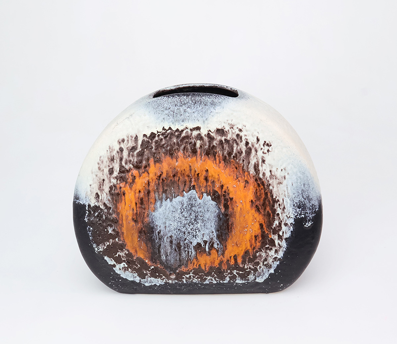 De vaas heeft een zwarte basis, waarover een grijze glazuurlaag is aangebracht. Deze wordt versterkt door een druipende oranje bruine cirkel. De dikke, reliëfrijke glazuren geven de vaas die typische Fat Lava-uitstraling en maken elk exemplaar uniek.