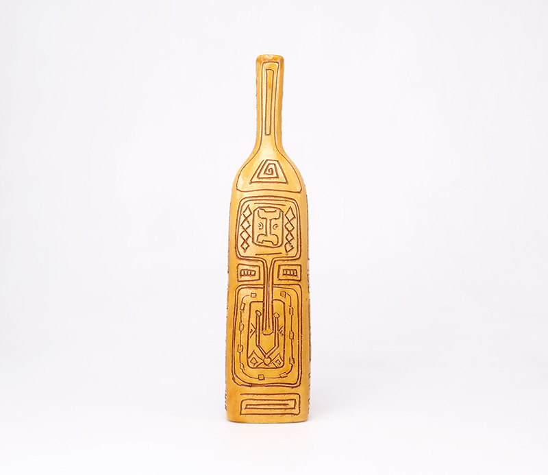 De decoraties doen denken aan native en Zuid-Amerikaanse motieven, wat het object een krachtige, bijna archetypische uitstraling geeft. Elk detail benadrukt het handgemaakte karakter en de artistieke visie achter het ontwerp.