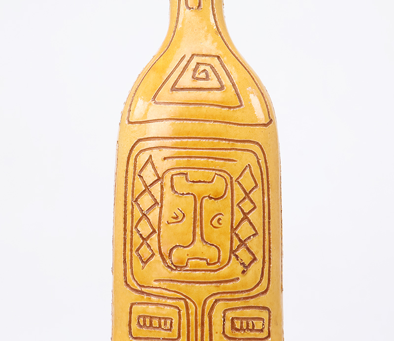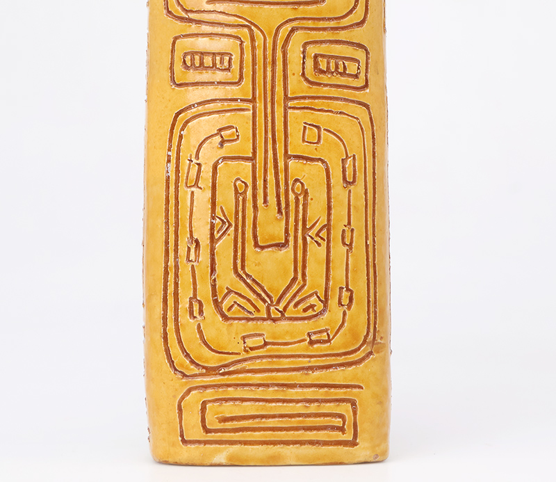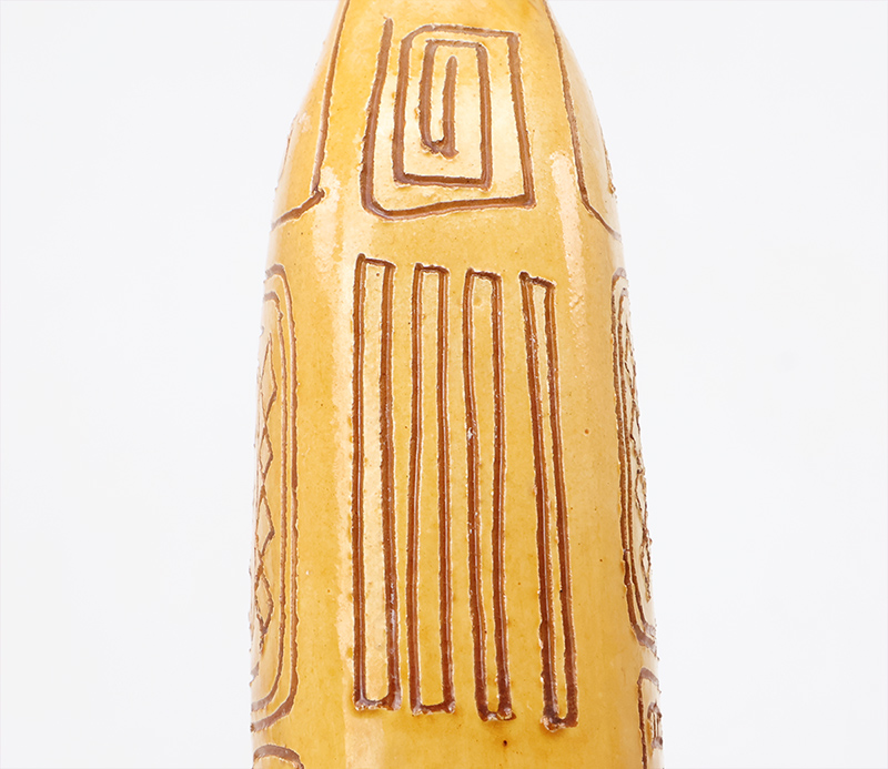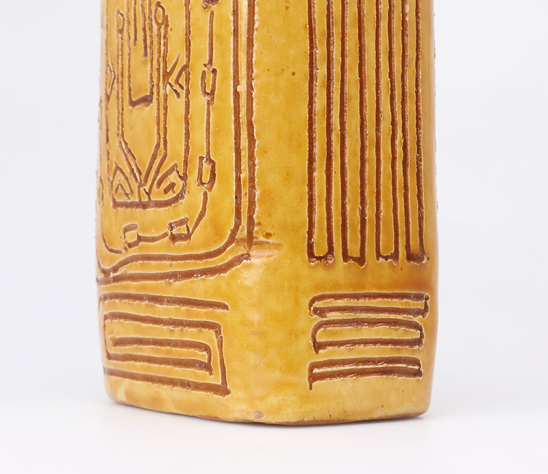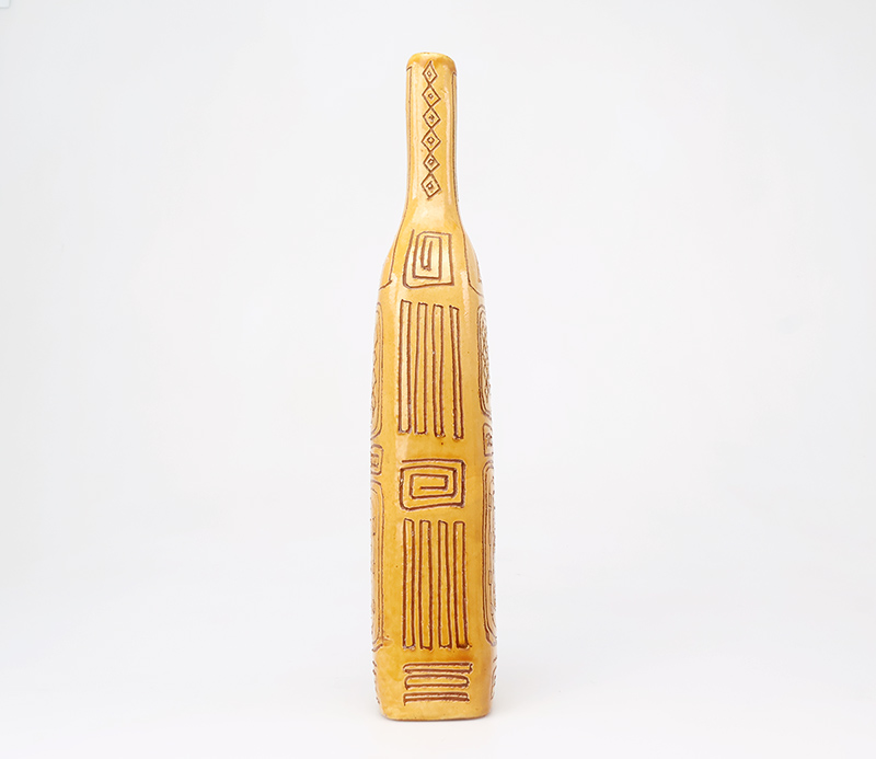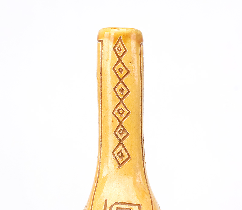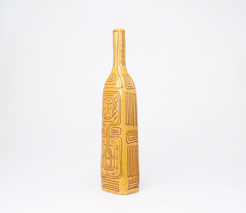 Deze bijzondere handgemaakte studio art fles vaas is vervaardigd uit keramiek, geglazuurd in een amber geel en bruin en rijk gedecoreerd met een verfijnd sgraffito motief. De vaas is ontworpen en geproduceerd door het iconische Igor Studio, een naam die synoniem staat voor artistiek vakmanschap en hoogwaardige keramische kunst.