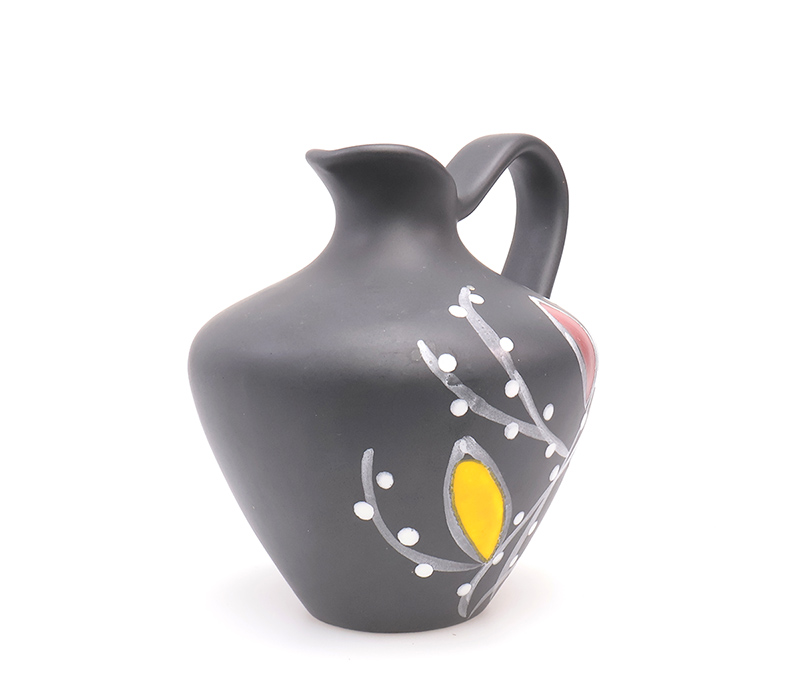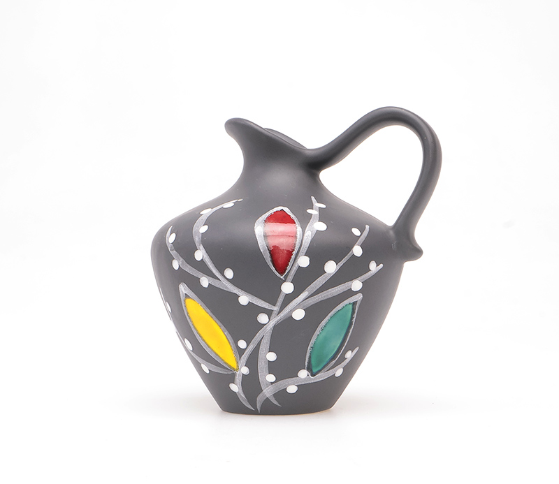 Het vaasje is mat zwart geglazuurd met handgeschilderd decor.