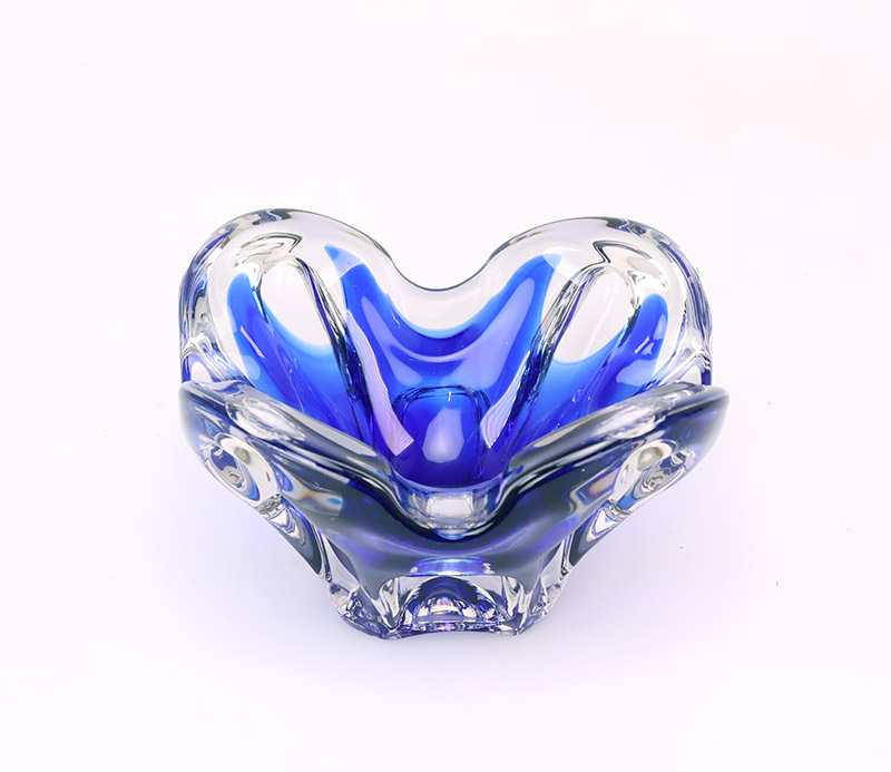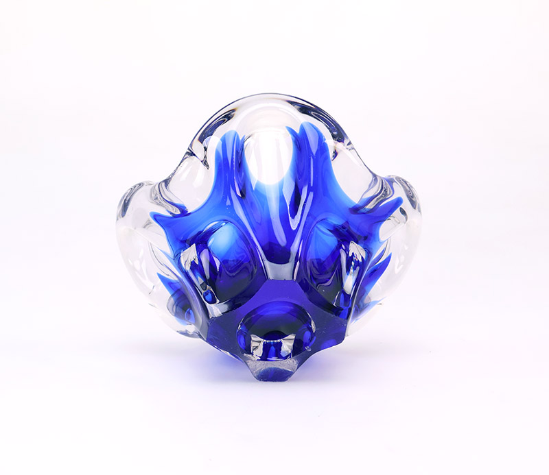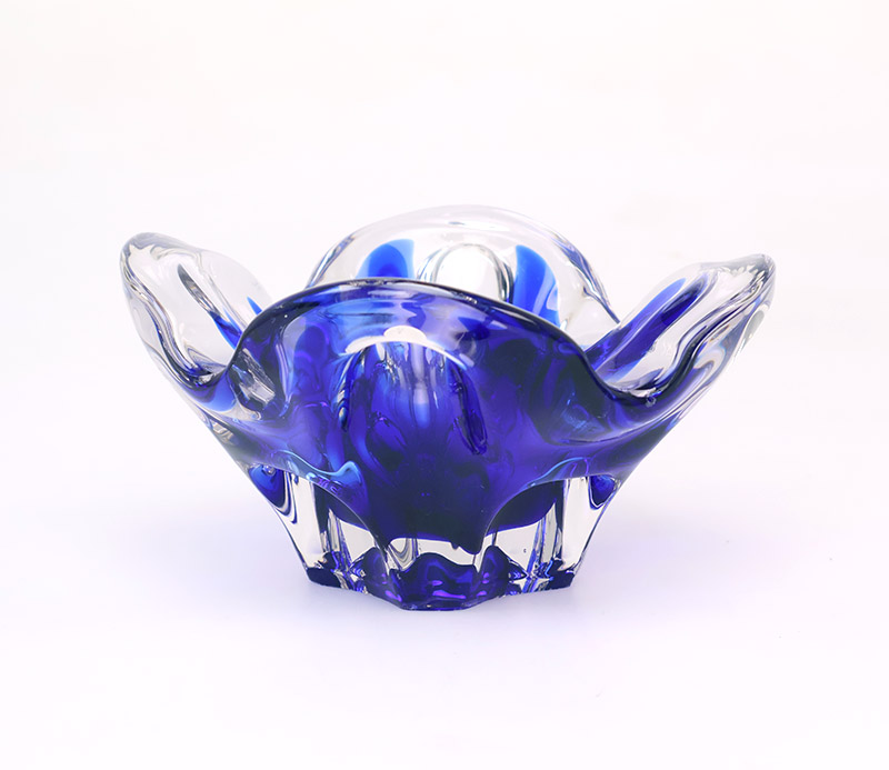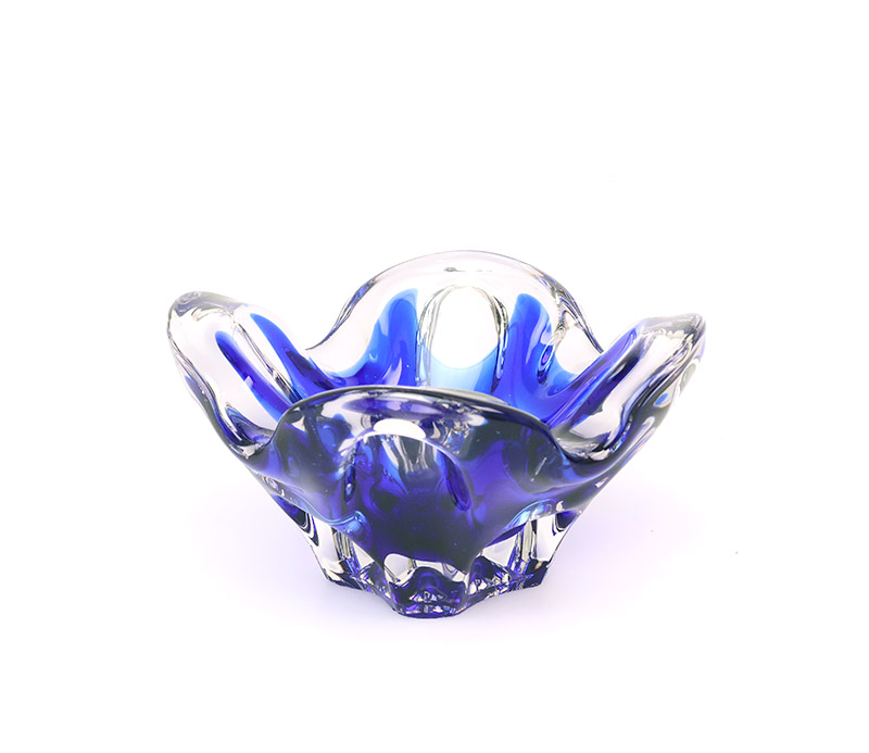 Het mondgeblazen glas heeft een golvende vorm en is uitgevoerd in blauw en helder glas. De combinatie van het diepe blauw en het transparante glas geeft het object een rustige, heldere uitstraling.