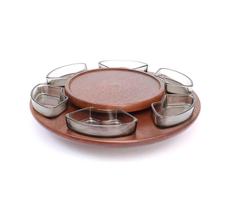 De ronde draaiplank is voorzien van dik glazen bakjes van groen rookglas en een centraal plateau in het midden. Ideaal om hapjes, tapas, nootjes of dips overzichtelijk en stijlvol te presenteren tijdens een borrel of diner. Dankzij het soepel draaiende mechanisme kan iedereen aan tafel gemakkelijk bij alle lekkernijen.