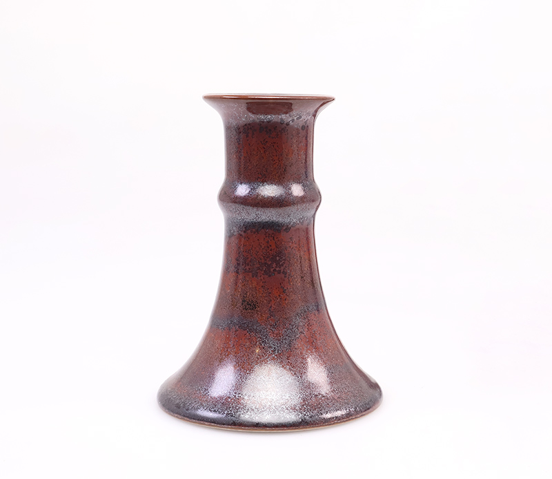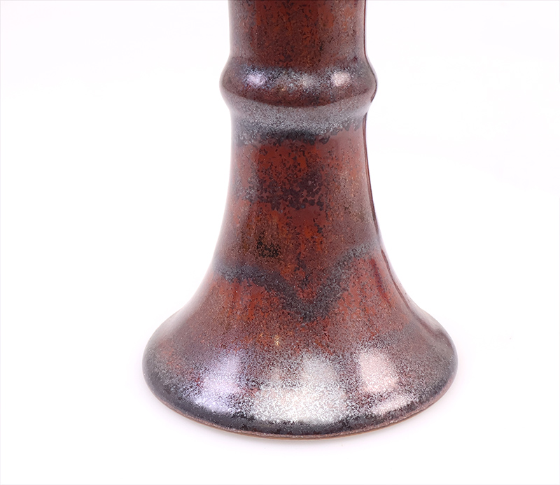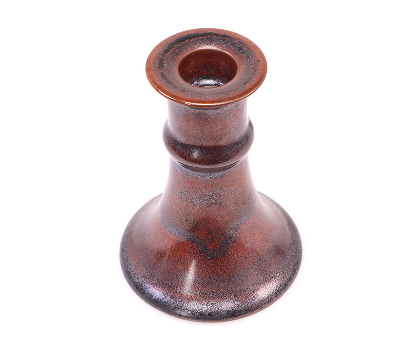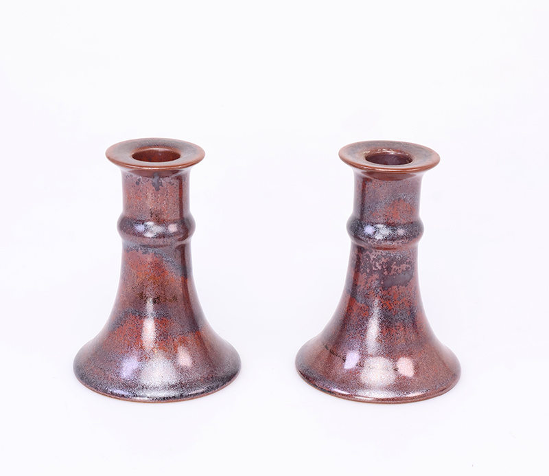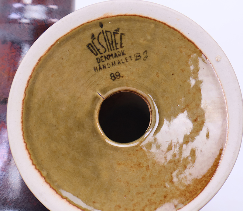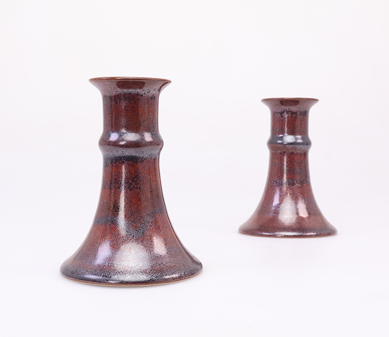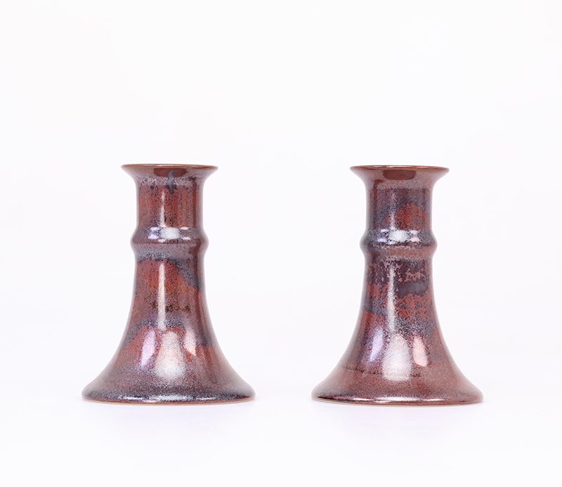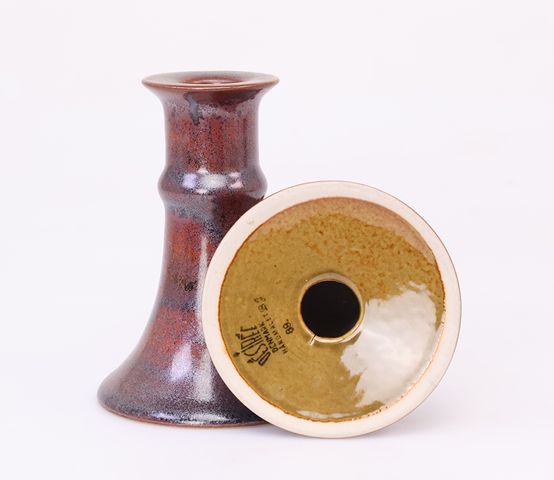 Prachtige set vintage aardewerken kandelaren van het Deense merk Désirée Stentøj. De kandelaren zijn uitgevoerd in een glanzend geglazuurd ossenbloedrood, met schitterende metallic effecten in het glazuur. Deze bijzondere kleurdiepte ontstaat door het gebruik van koperoxide, wat zorgt voor een levendig en karaktervol oppervlak.