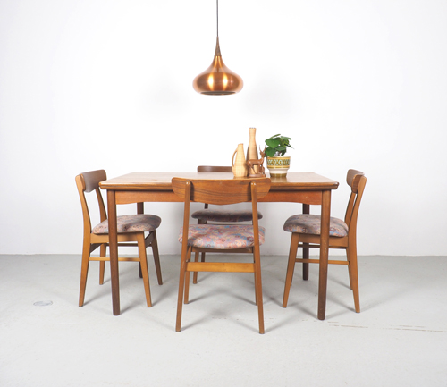 Teak houten tafel met 2 uitschuif bladen geproduceerd in Denemarken in de jaren 60.