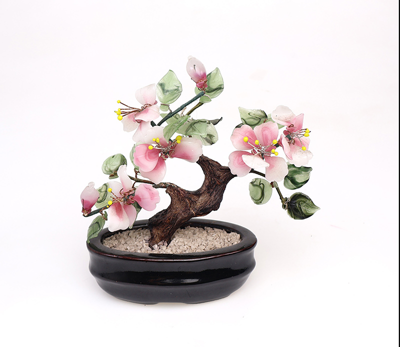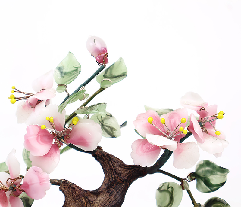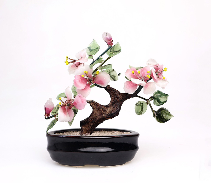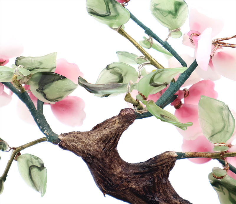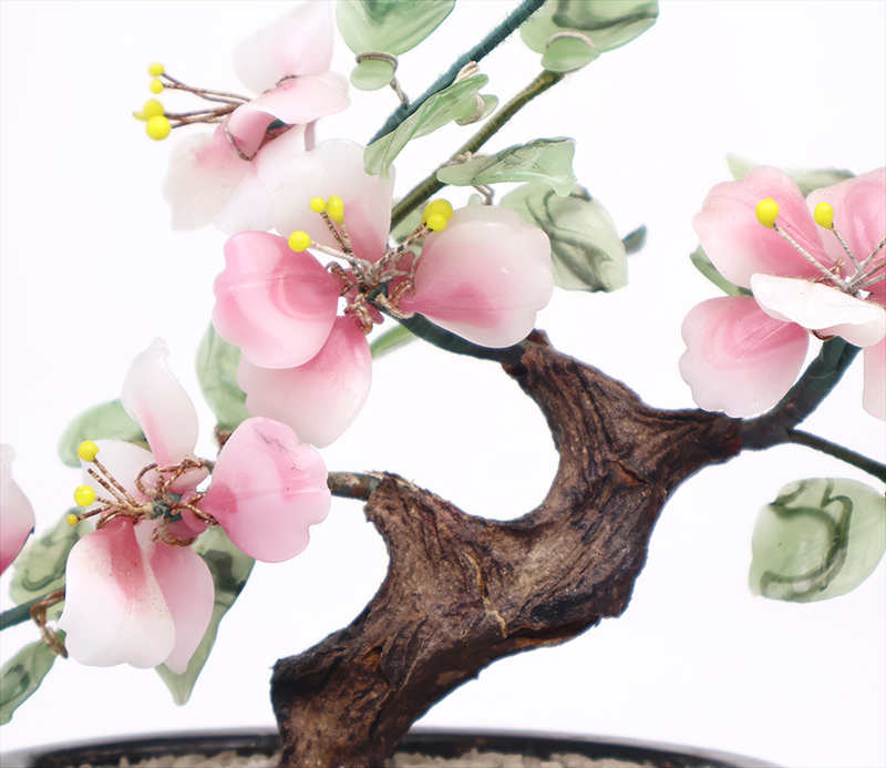Vintage handgemaakt boompje met bloesems van glas en jade, Japan 1970s.