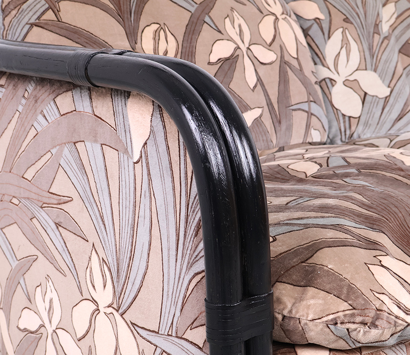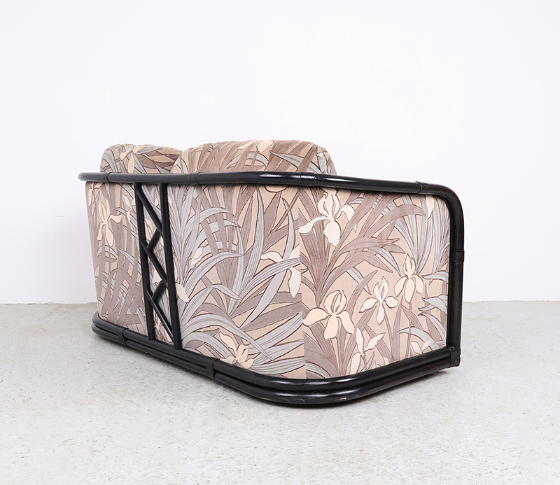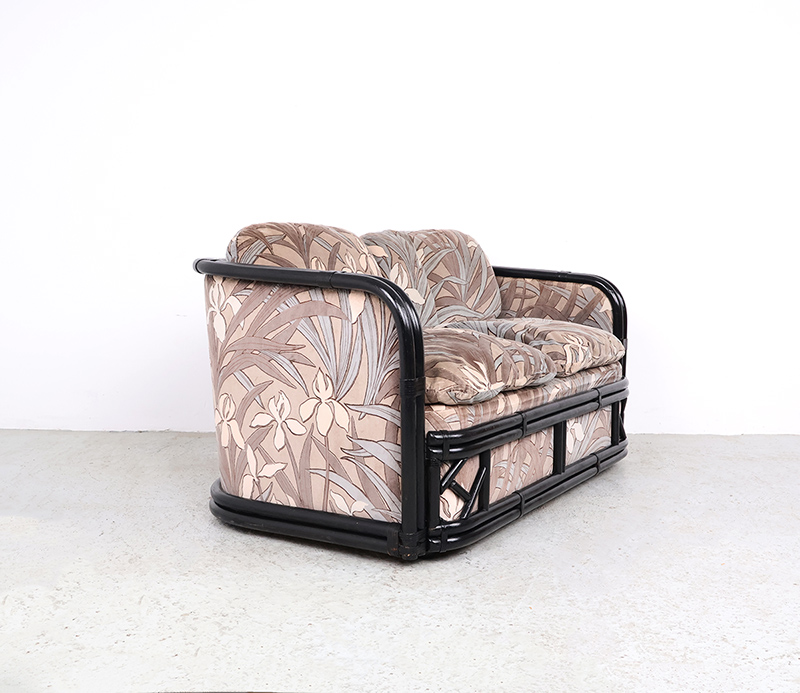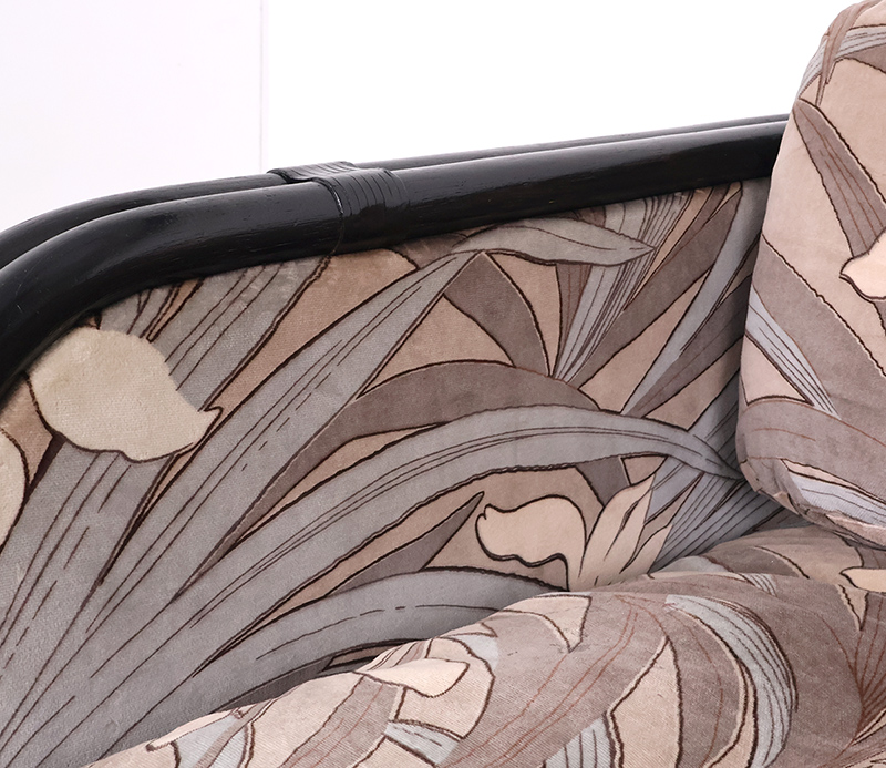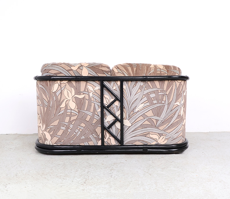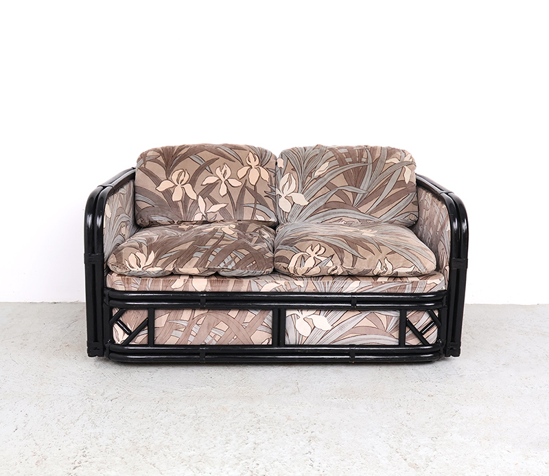 Dit compacte 2-persoons vintage bankje uit de jaren ’70 ademt pure boho-chic. Het zwart gelakte bamboe frame geeft het ontwerp een elegante, bijna grafische uitstraling en vormt een prachtig contrast met de rijke velours bekleding.