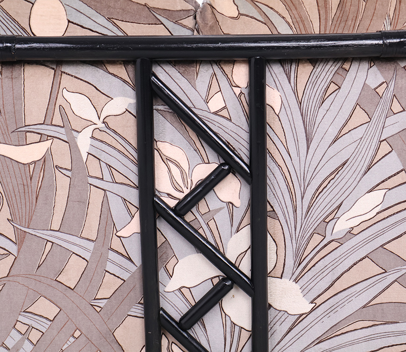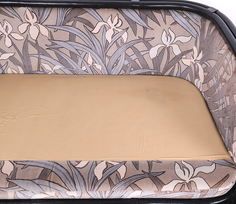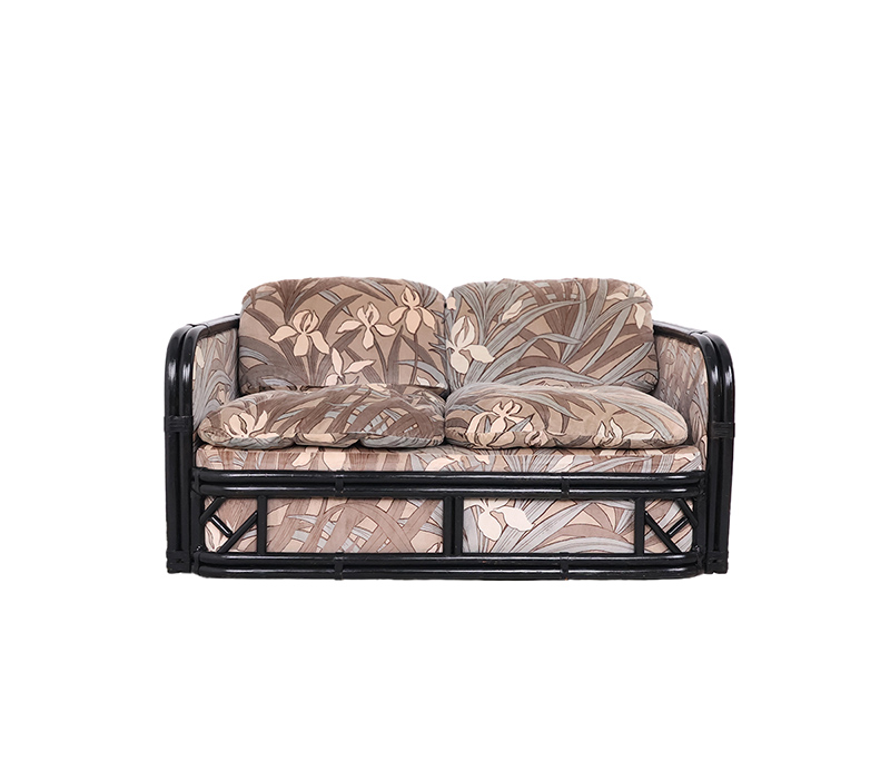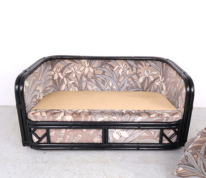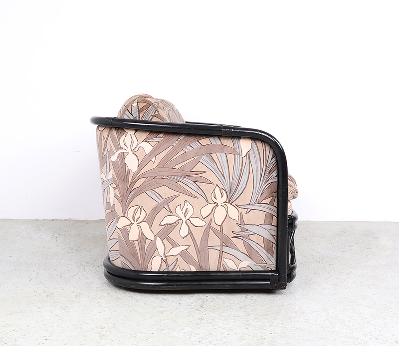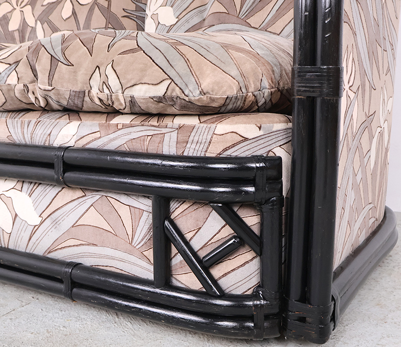 Dit compacte 2-persoons vintage bankje uit de jaren ’70 ademt pure boho-chic. Het zwart gelakte bamboe frame geeft het ontwerp een elegante, bijna grafische uitstraling en vormt een prachtig contrast met de rijke velours bekleding.