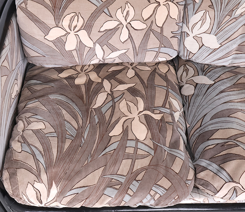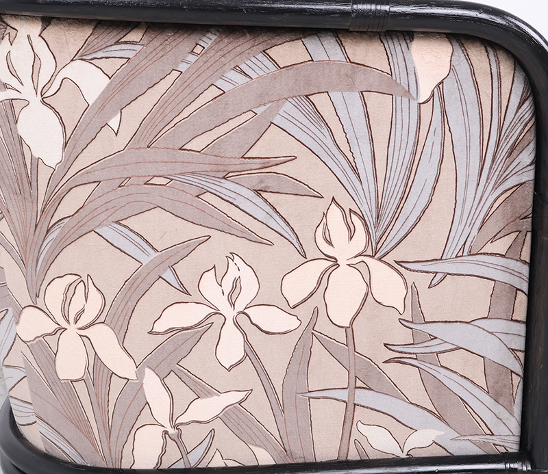 De bloemige velour stof is gedecoreerd met lelies en bladeren in verfijnde tinten crème, bruin en grijsgroen, wat het bankje een warme en karaktervolle uitstraling geeft. De combinatie van natuurlijke materialen en luxe textiel maakt dit stuk zowel speels als stijlvol.