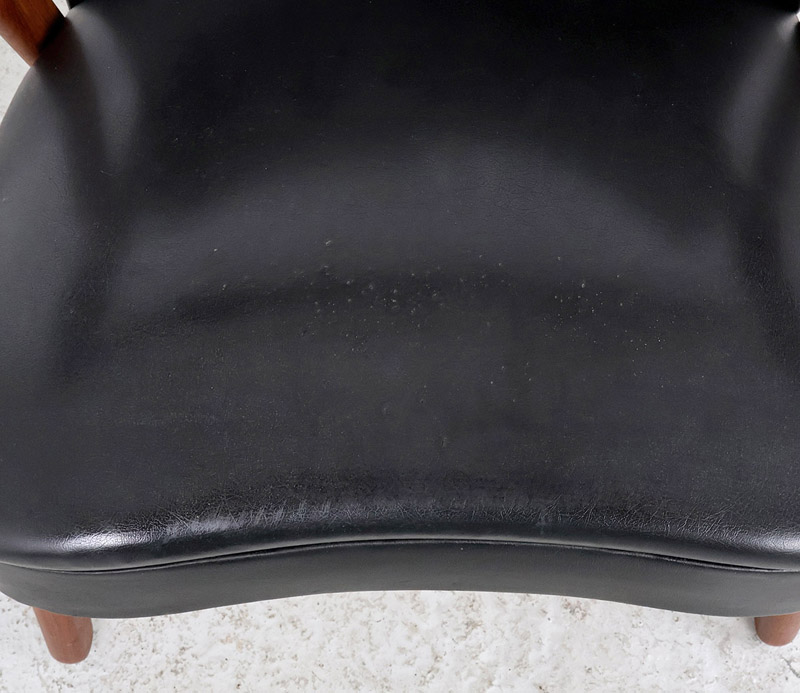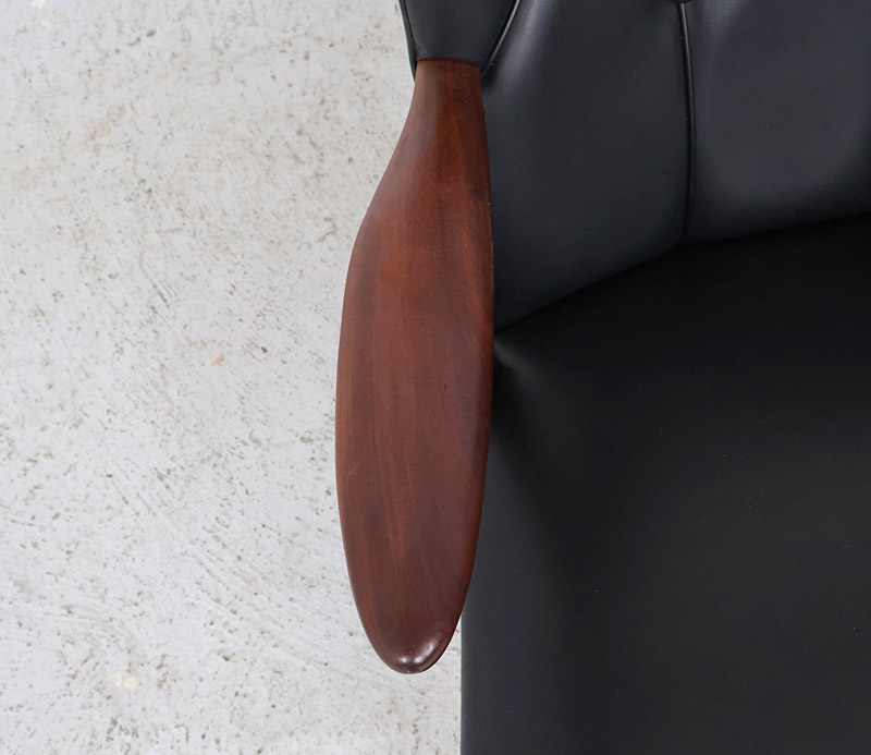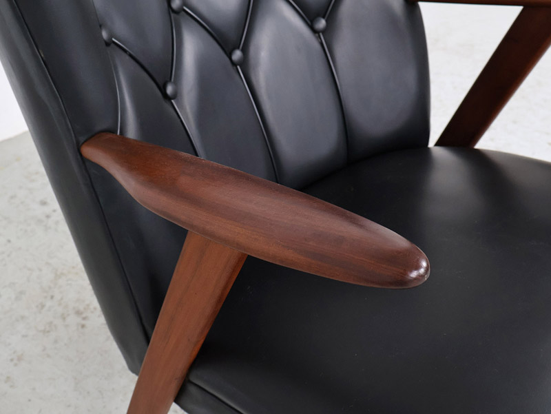 De stoelen zijn uitgevoerd met elegante teakhouten armleuningen en poten, en bekleed met het originele zwarte skai, wat zorgt voor een mooi contrast tussen het warme hout en de strakke bekleding.