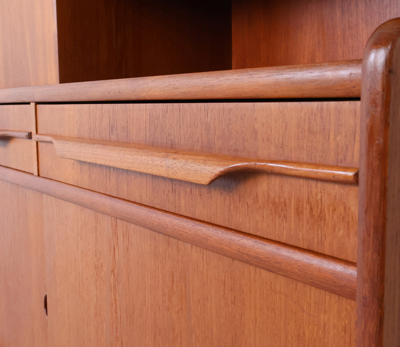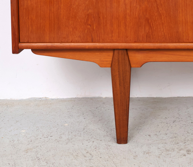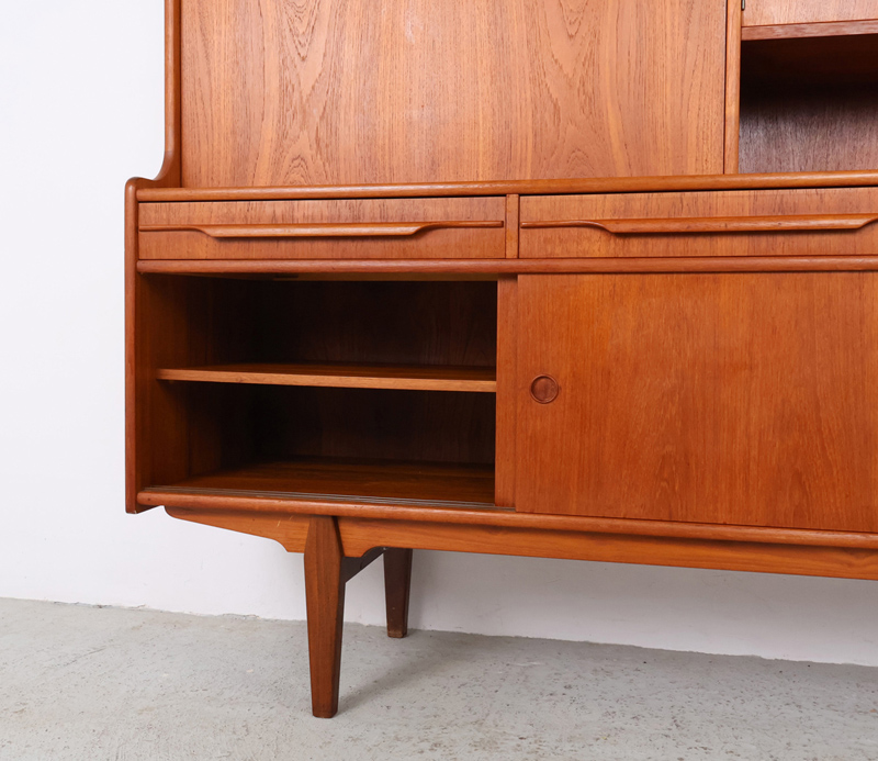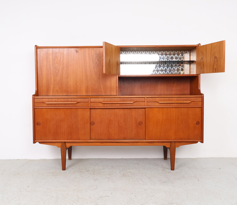 Buffetkast of highboard uitgevoerd in teakfineer de kast kenmerkt zich door de typische Deense vormgeving met slanke lijnen en verfijnde details. Het meubel biedt veel opbergruimte en is ingedeeld in verschillende compartimenten.