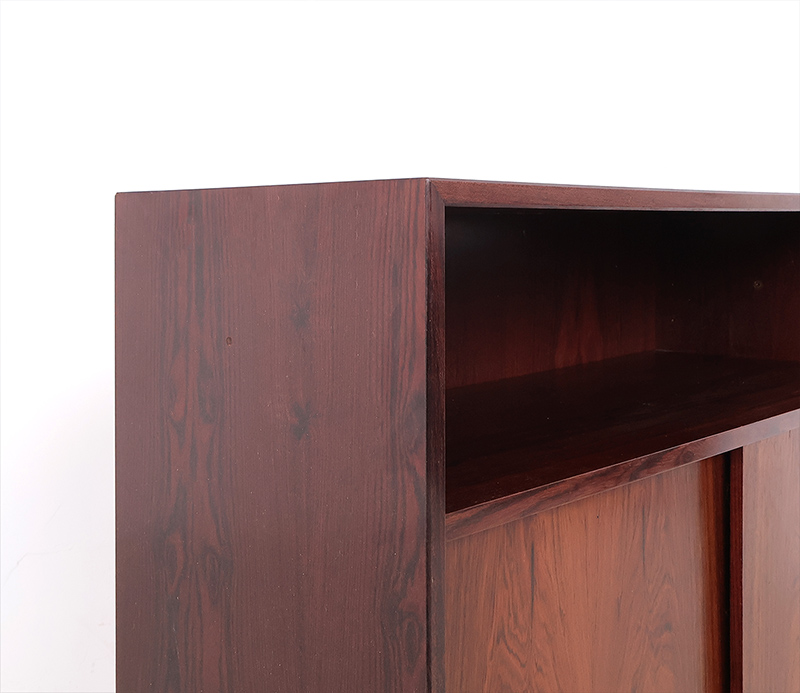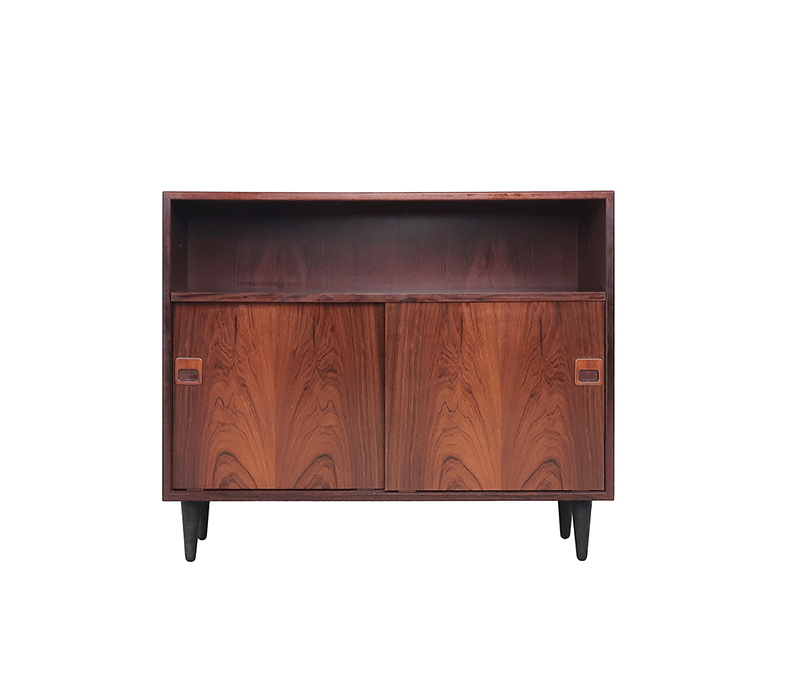 De kast heeft 2 schuifdeuren met daarboven een open ruimte en staat op zwart houten poten.