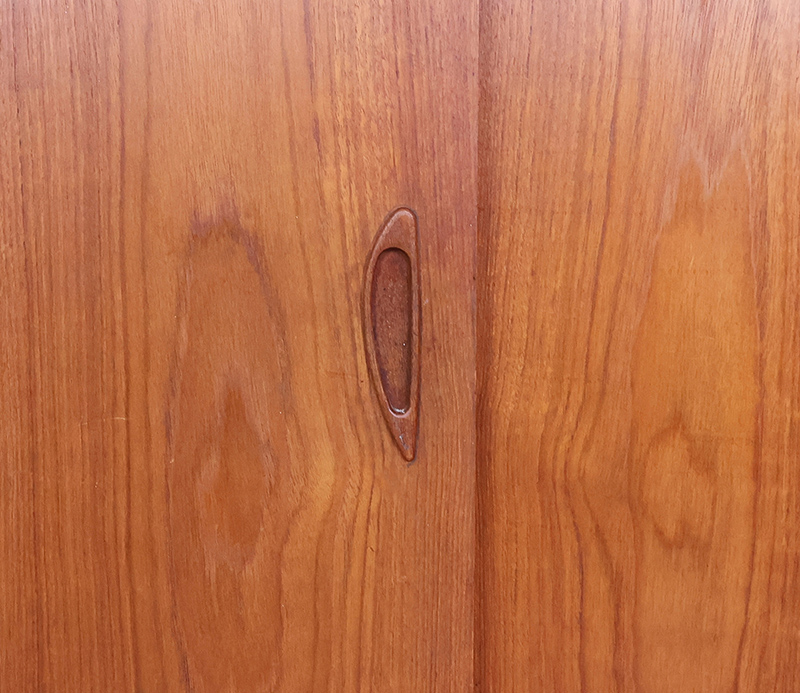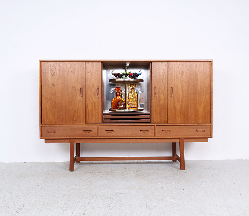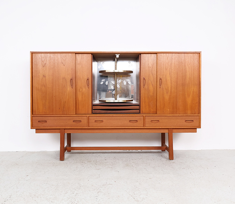 Deze prachtige kast is afgewerkt met warm teakfineer en voorzien van vier soepel schuivende deuren. In het midden bevindt zich een bijzonder barcompartiment met geïntegreerde verlichting en een draaibare etagère – ideaal voor het stijlvol presenteren van drankflessen en glazen. Onder het bargedeelte bevinden zich twee smalle lades, perfect voor het opbergen van bestek of baraccessoires.
