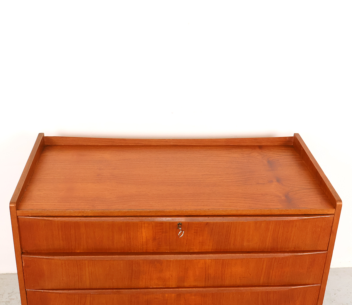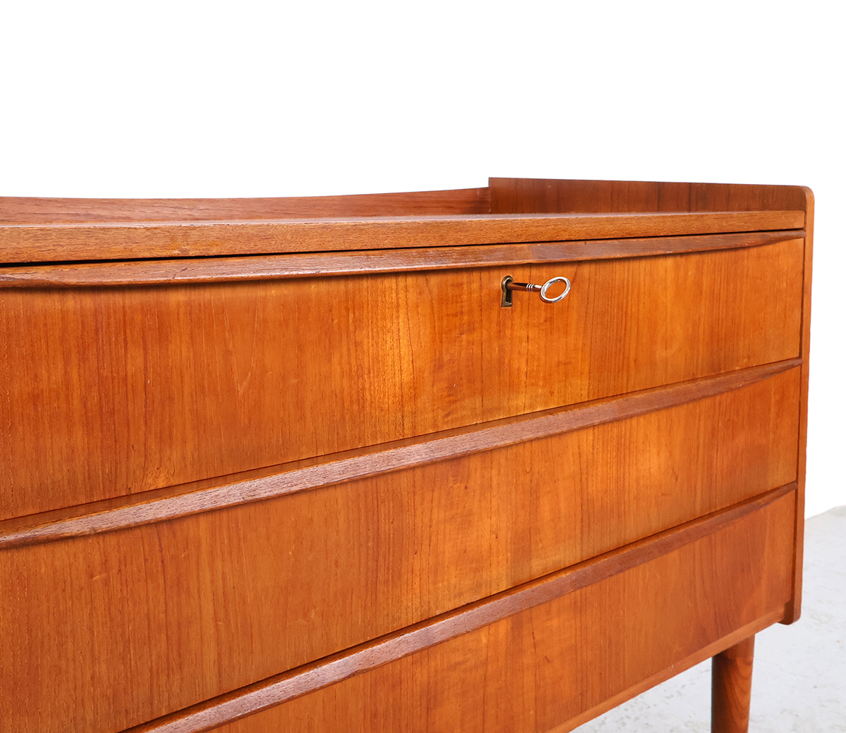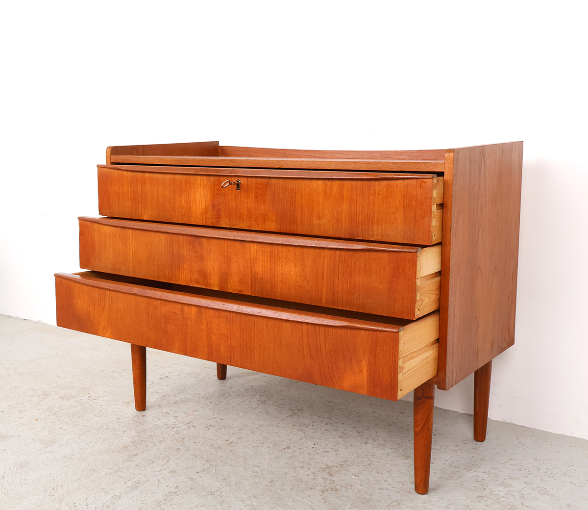 De kast is uitgevoerd in teakfineer en kenmerkt zich door een strakke, licht afgeronde vormgeving met subtiele belijning in de ladenfronten. De warme houttekening en slanke poten geven het geheel een typisch Scandinavische uitstraling.