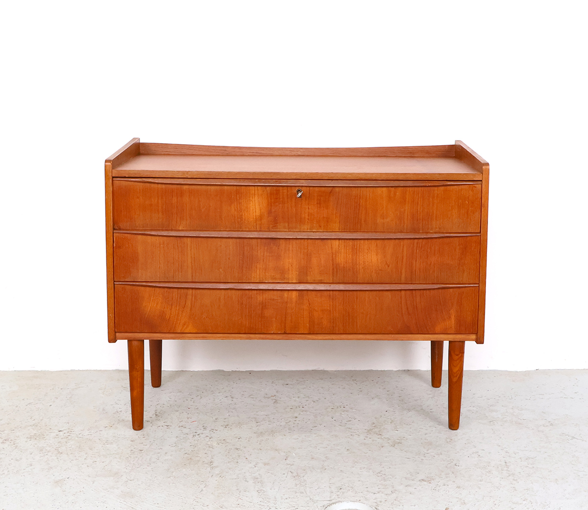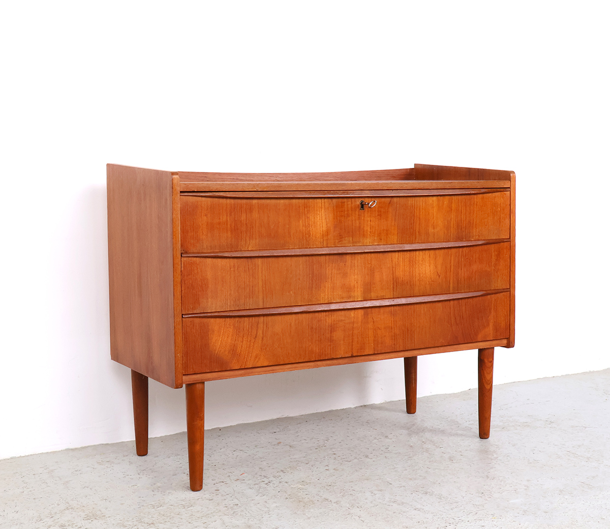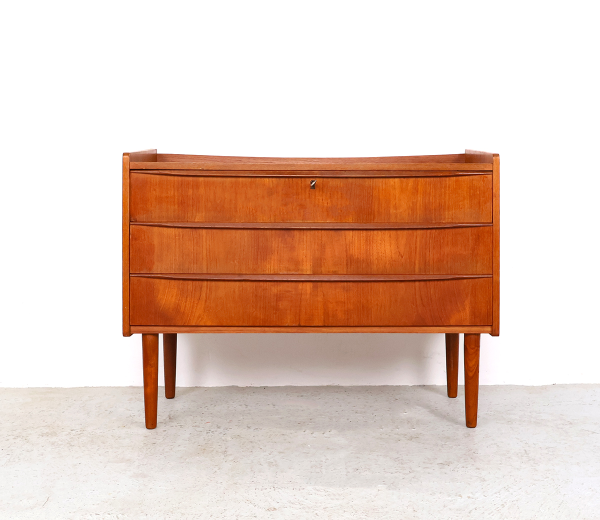 De kast is uitgevoerd in teakfineer en kenmerkt zich door een strakke, licht afgeronde vormgeving met subtiele belijning in de ladenfronten. De warme houttekening en slanke poten geven het geheel een typisch Scandinavische uitstraling.