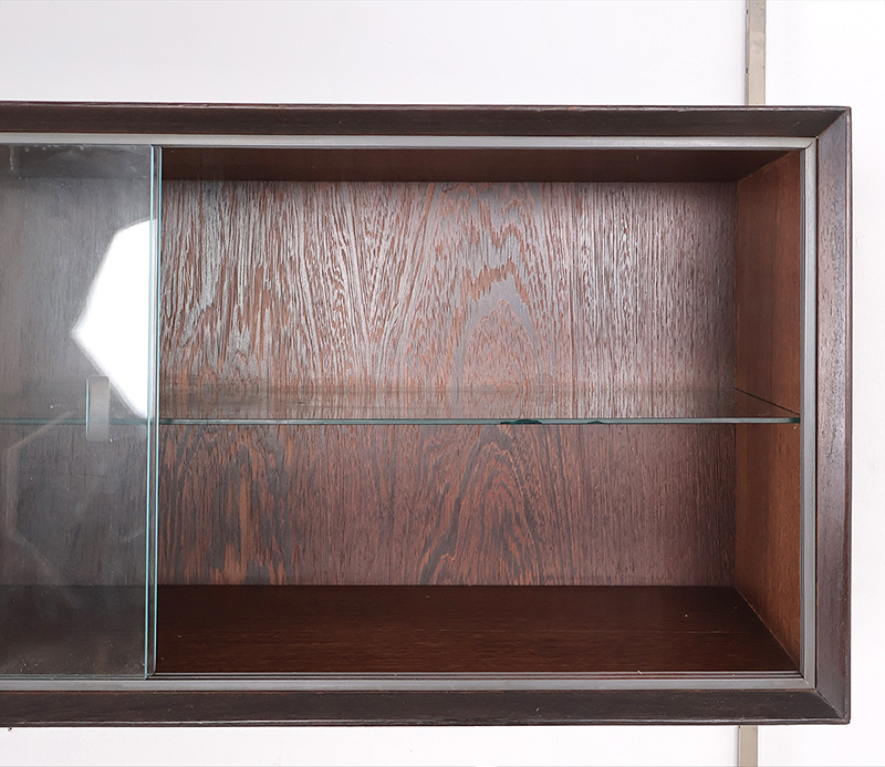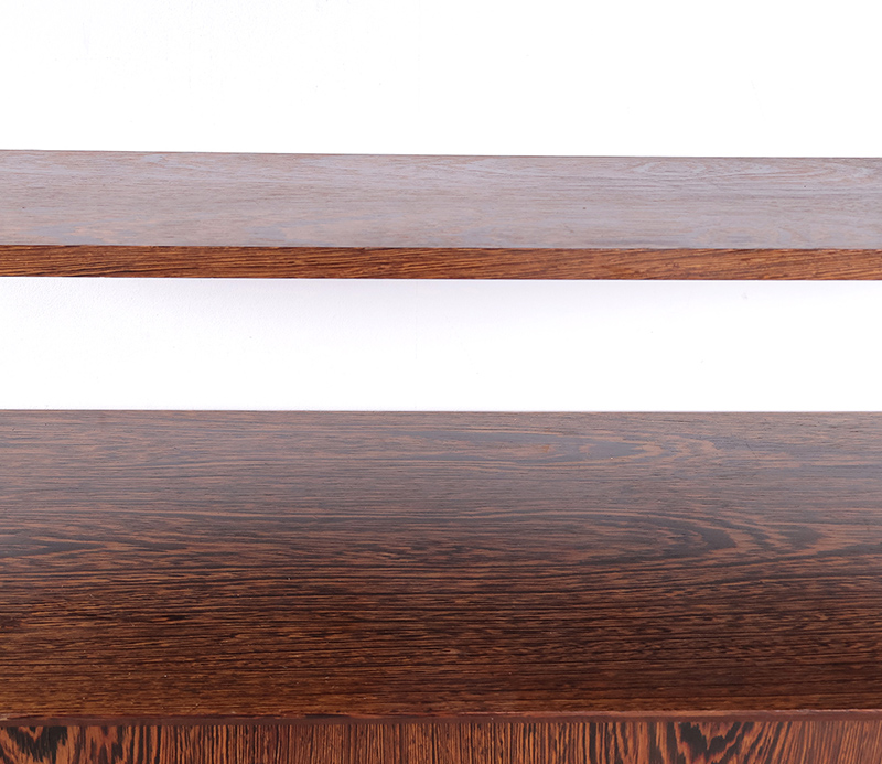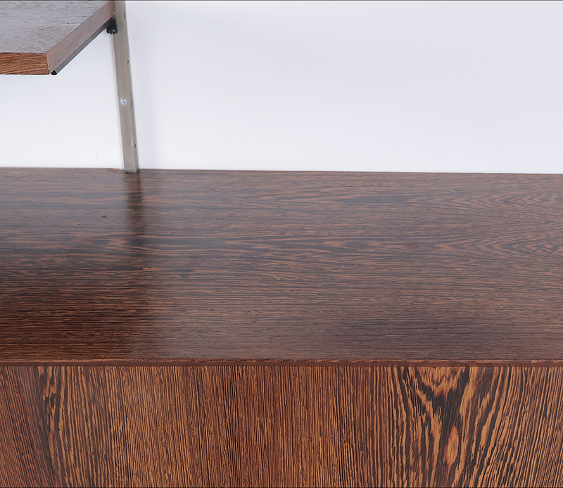 Het meubel is uitgevoerd in gefineerd wenge hout, wat zorgt voor een warme, luxe uitstraling en een echte mid-century modern sfeer.