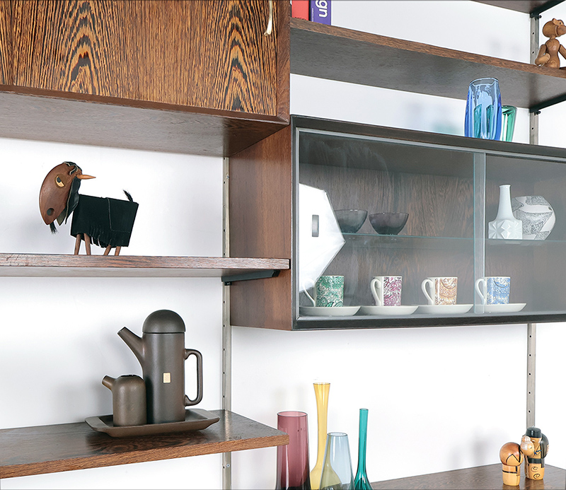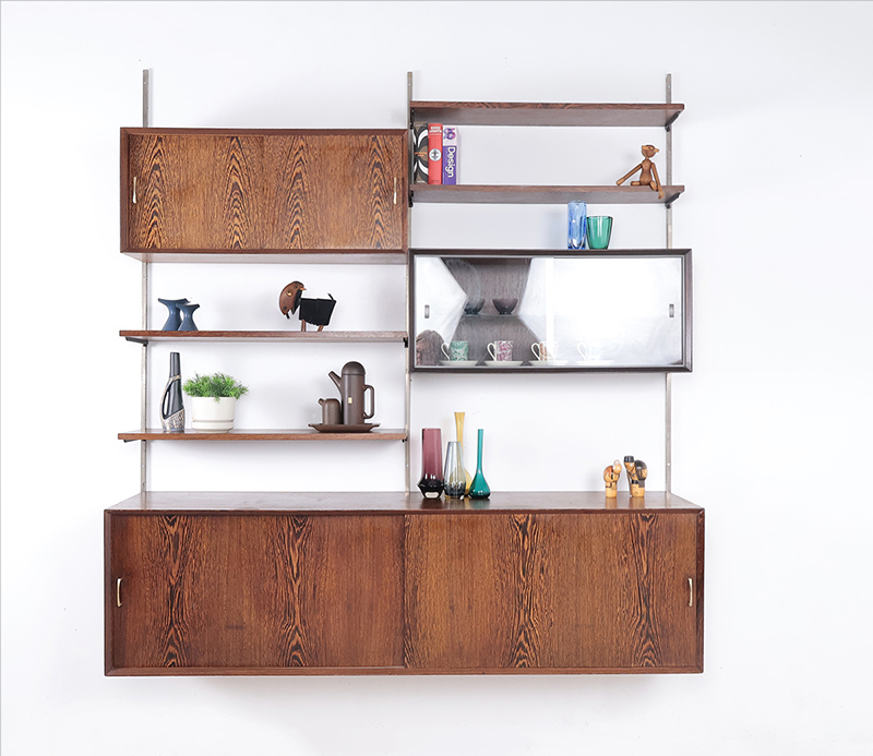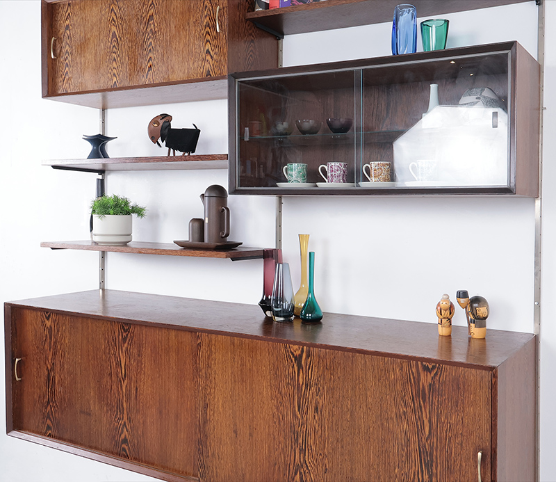 Dit systeem bestaat uit metalen muurlatten, een lange onderkast/dressoir, een vitrinekastje en een kastje met schuifdeur. De indeling is volledig modulair: je kunt de onderdelen naar eigen inzicht ophangen en samenstellen.