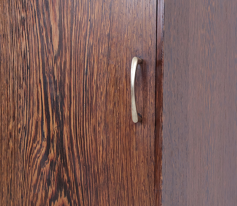 De kast verkeert in goede vintage conditie, met normale sporen door leeftijd en gebruik en slechts een paar kleine, nette reparaties aan het fineer die nauwelijks opvallen en niets afdoen aan de uitstraling of stevigheid.