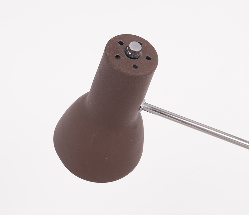 De hengellamp heeft een verstelbare arm met mat bruine kap.
