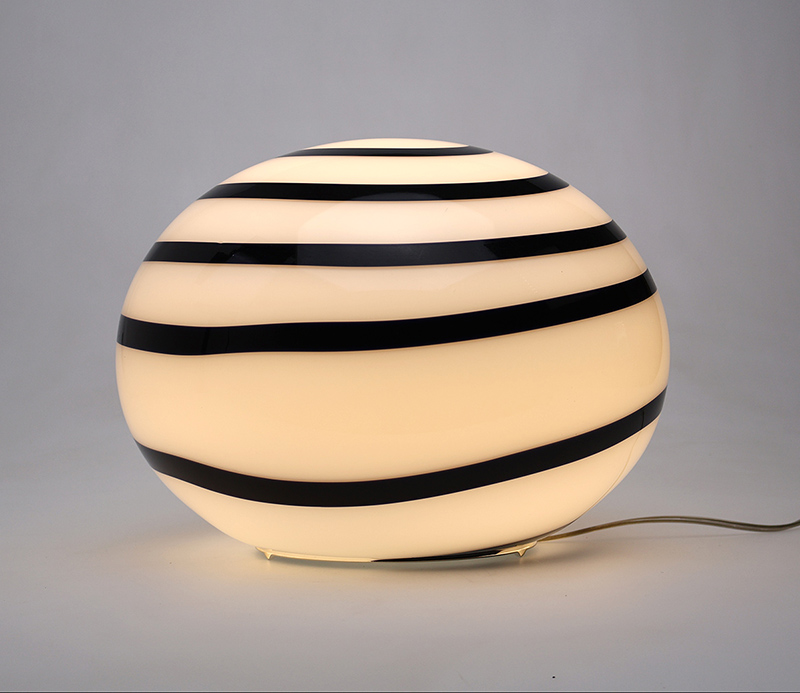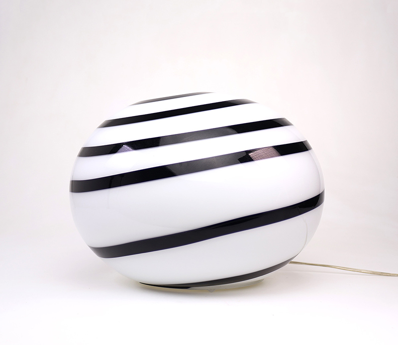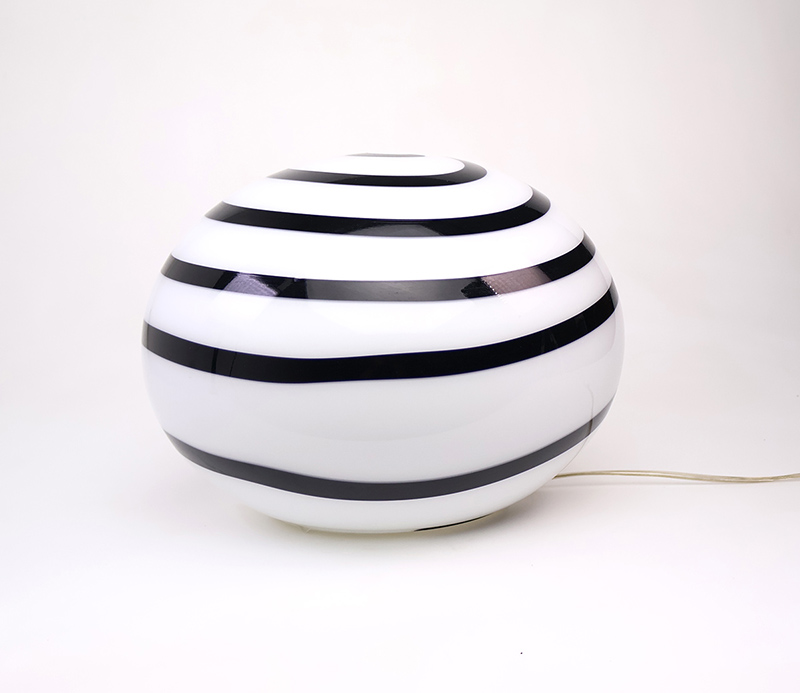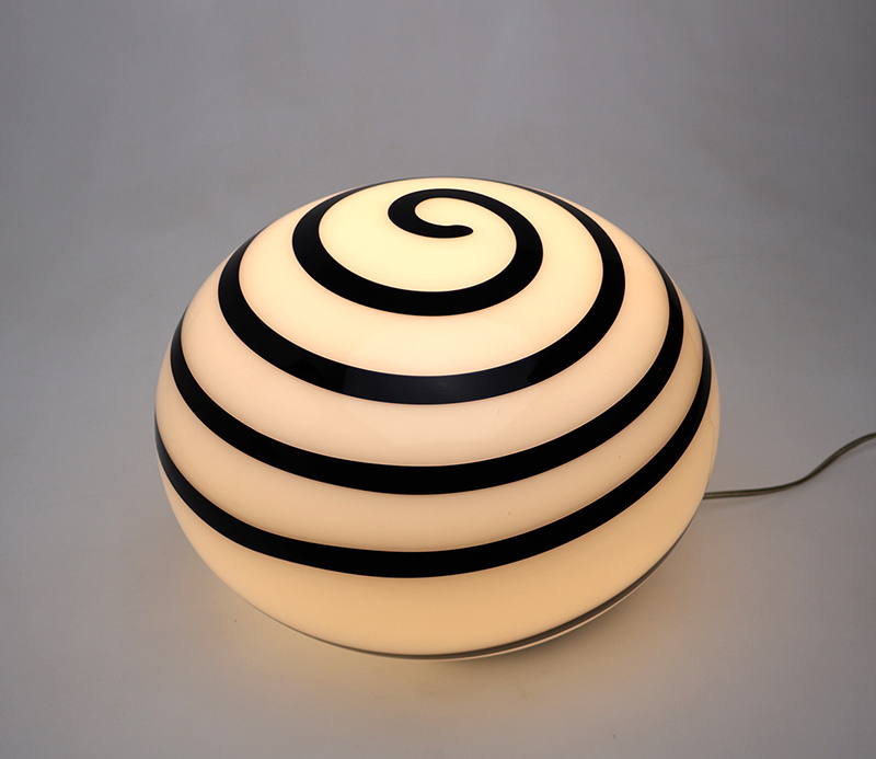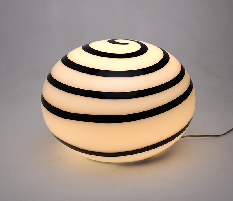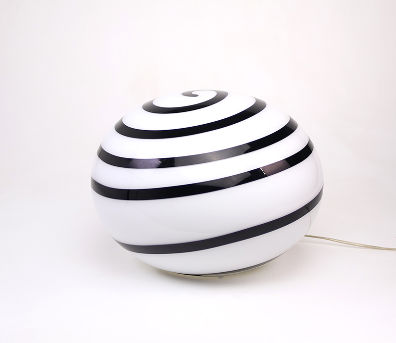 De lamp bestaat uit een grote melkglazen mondgeblazen bol met een zwarte spiraal gemaakt in Murano Venetië.