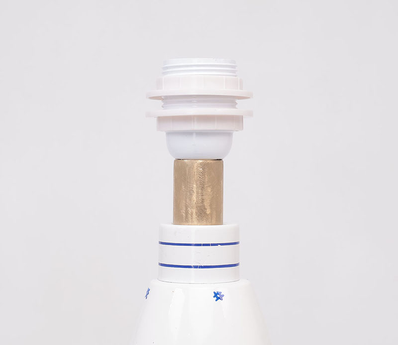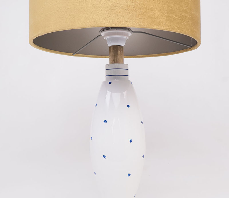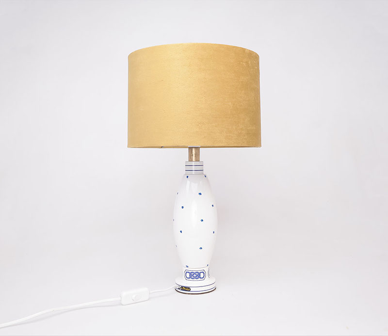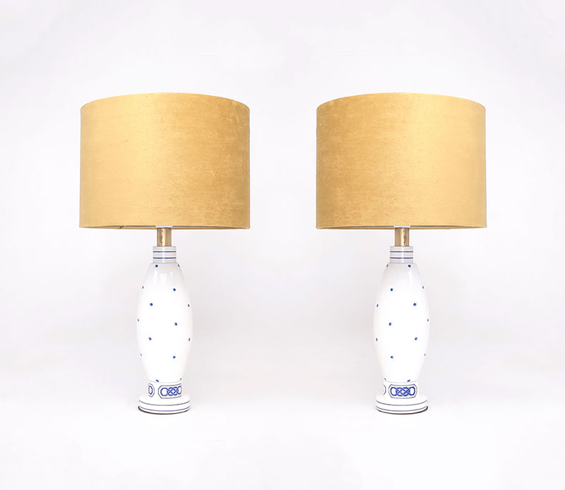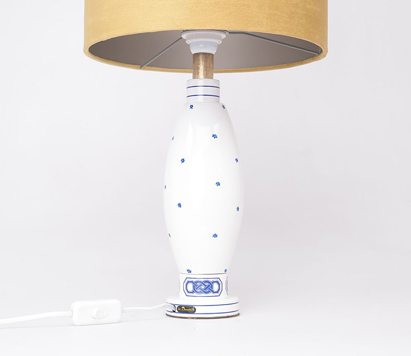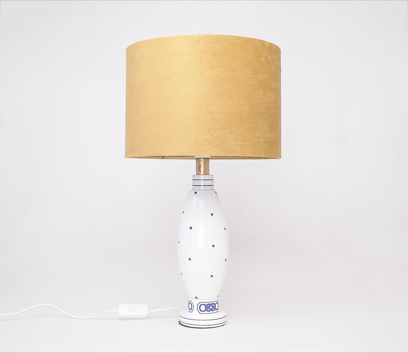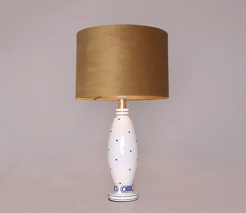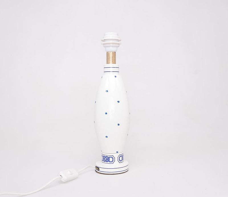 De lampen zijn glimmend wit geglazuurd met blauwe tekeningen aan de voet met de oneindige knoop.
