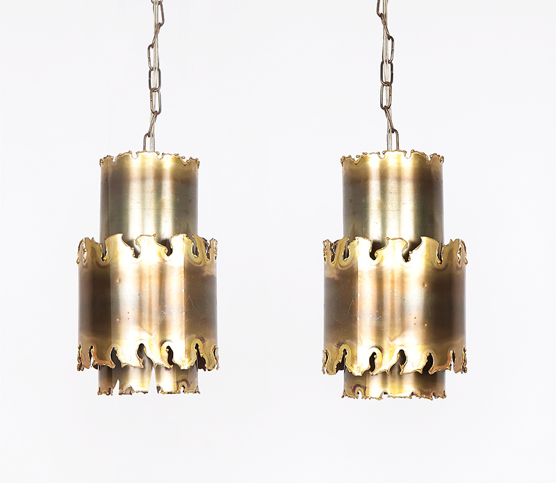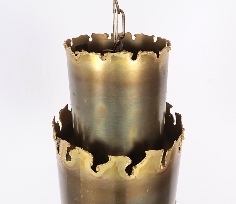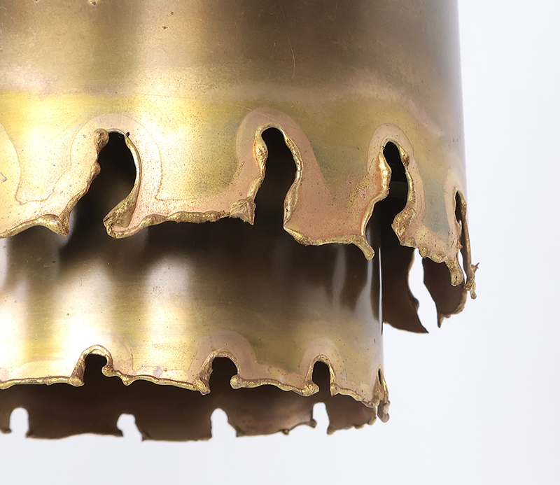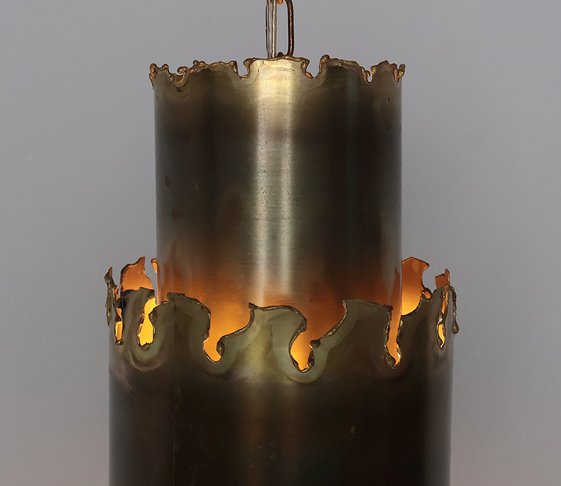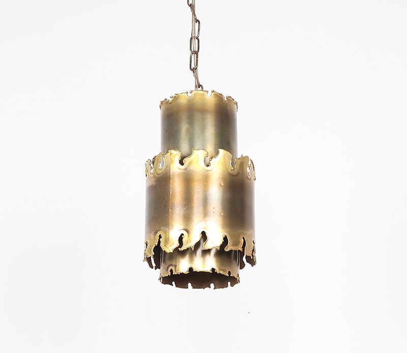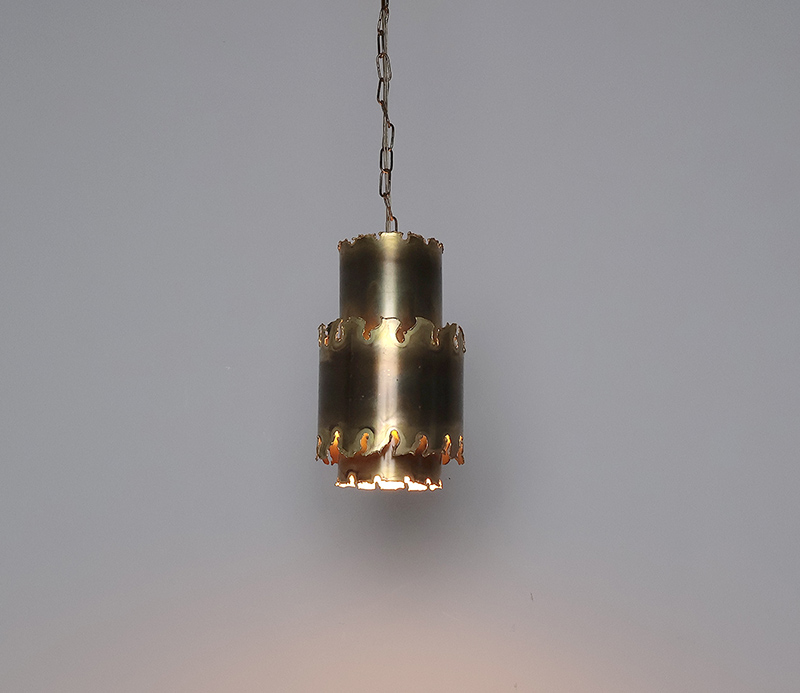 De lampen zijn opgebouwd uit drie ronde messing delen, die zijn bewerkt met zuur en een brander. Deze bewerking zorgt voor een uitgesproken, stoer brutalist uiterlijk met veel textuur en diepte. De lampen geven direct licht naar beneden en laten daarnaast licht door tussen de messing bladen, wat zorgt voor een functionele maar sfeervolle lichtverdeling.