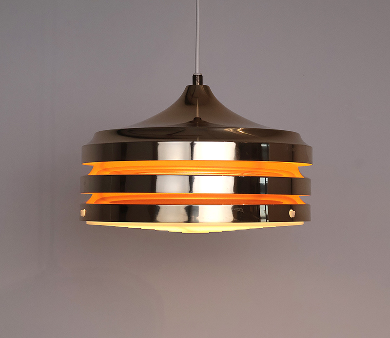 Mooie hanglamp gemaakt van lagen goud kleurig aluminium met een oranje gelakte binnenkant wat een mooie warme gloed verspreid.