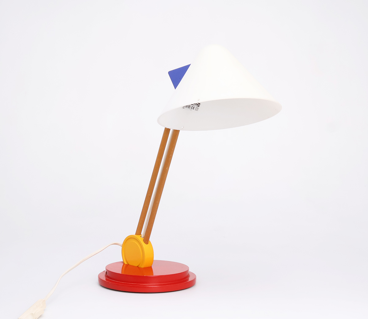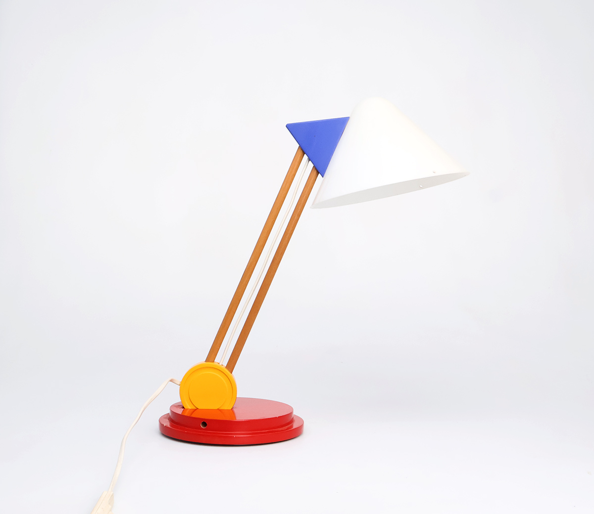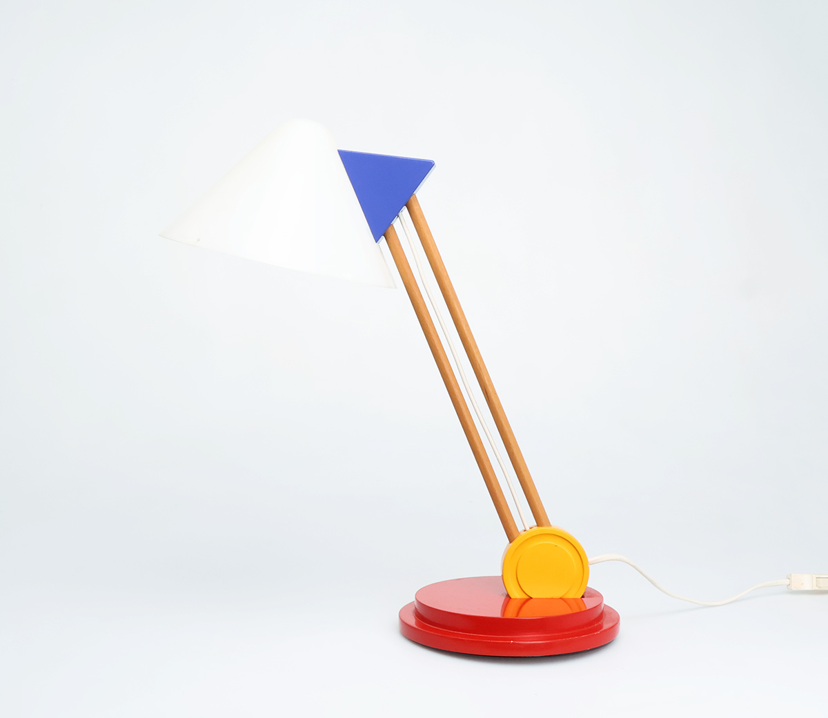 Deze vintage lamp is een prachtig voorbeeld van de speelse en expressieve Memphis-stijl die eind jaren ’80 populair was.