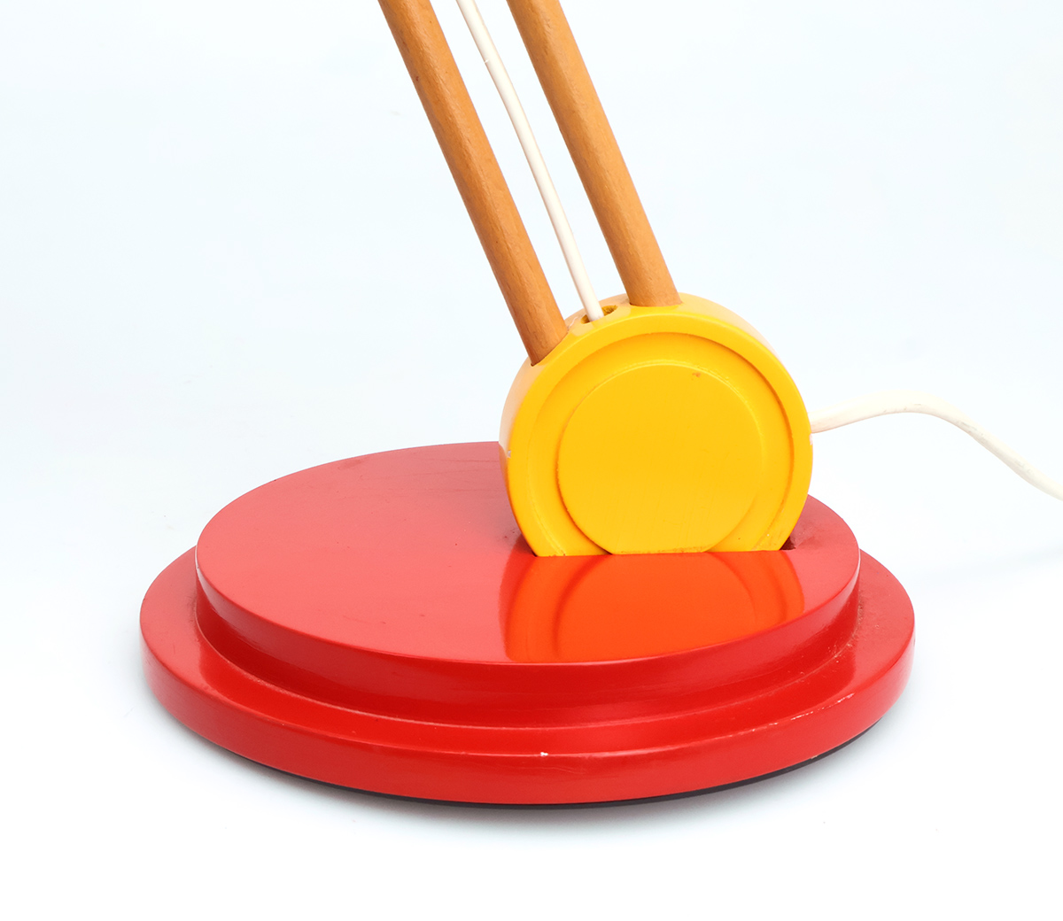 De lamp is vervaardigd uit hout en afgewerkt met lak in de opvallende kleuren geel, rood en blauw, wat zorgt voor een krachtig grafisch geheel. De melkwitte kunststof kap verspreidt het licht op een zachte en aangename manier, ideaal voor gebruik op een bureau, nachtkastje of als decoratief accent in de woonkamer. De ronde voet is draaibaar, waardoor je de lamp eenvoudig in de gewenste richting kunt positioneren.