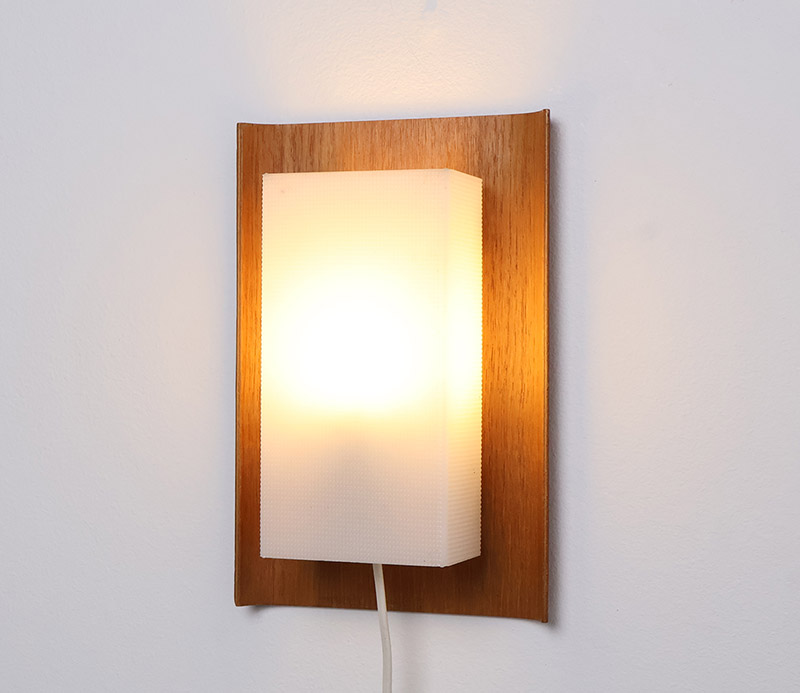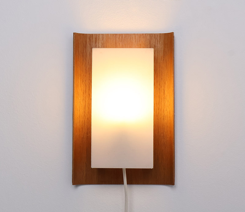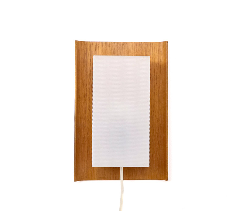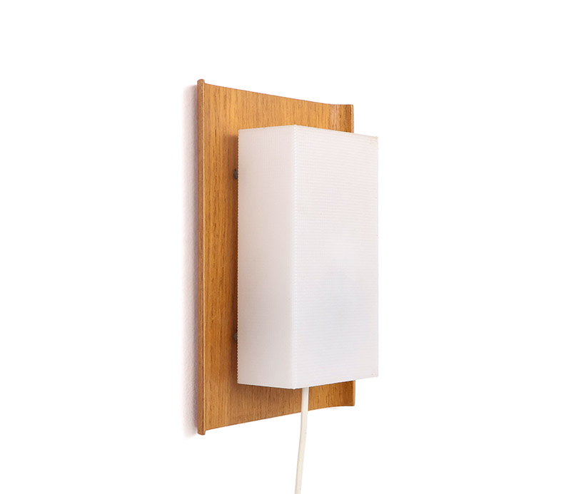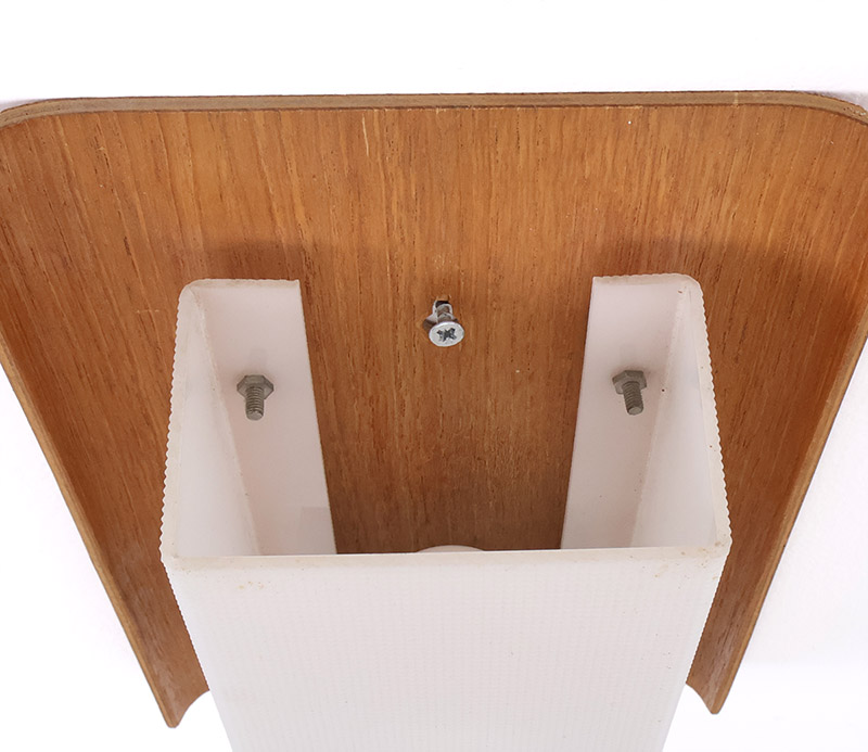 De achterplaat bestaat uit een elegant gevormd teak paneel dat aan de zijkanten licht ombuigt, Hierop is een wit kunststof kapje geplaatst met een geribbelde structuur, dat zorgt voor een gelijkmatige en diffuse lichtverdeling. Dit resulteert in een warme en aangename lichtuitstraling.
