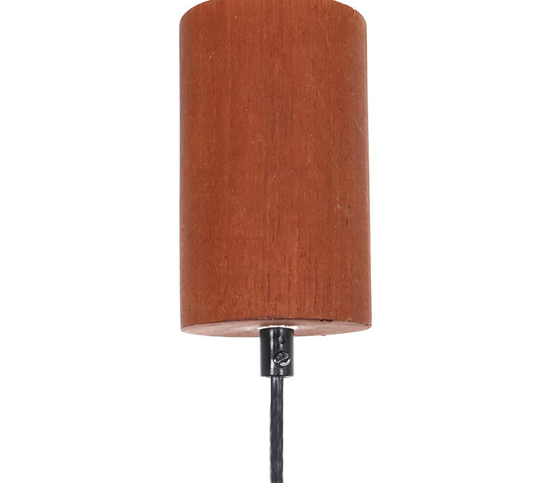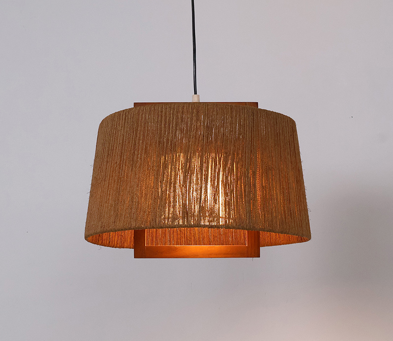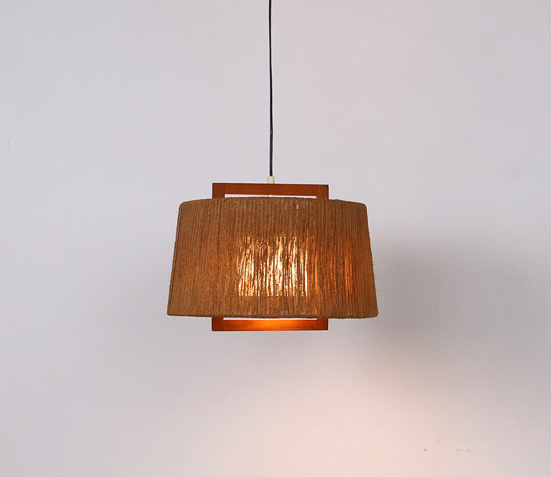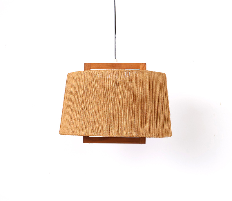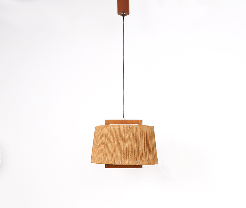 Deze hanglamp is uitgevoerd in teakhout met een kap van gevlochten sisal. De combinatie van natuurlijke materialen en het strakke lijnenspel geeft het object een warme, rustige uitstraling die kenmerkend is voor het mid-century modern design.