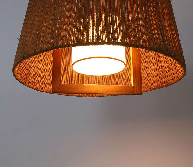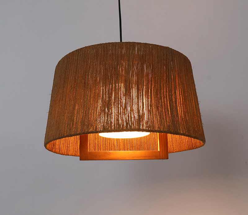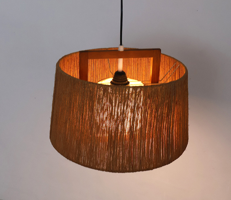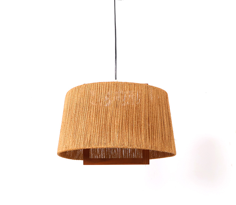 Het sisal zorgt voor een zacht diffuus lichtbeeld, terwijl de teakhouten elementen een subtiel grafisch accent toevoegen. Door het gebruik van natuurlijke vezels ontstaat een licht spel van schaduw en structuur.