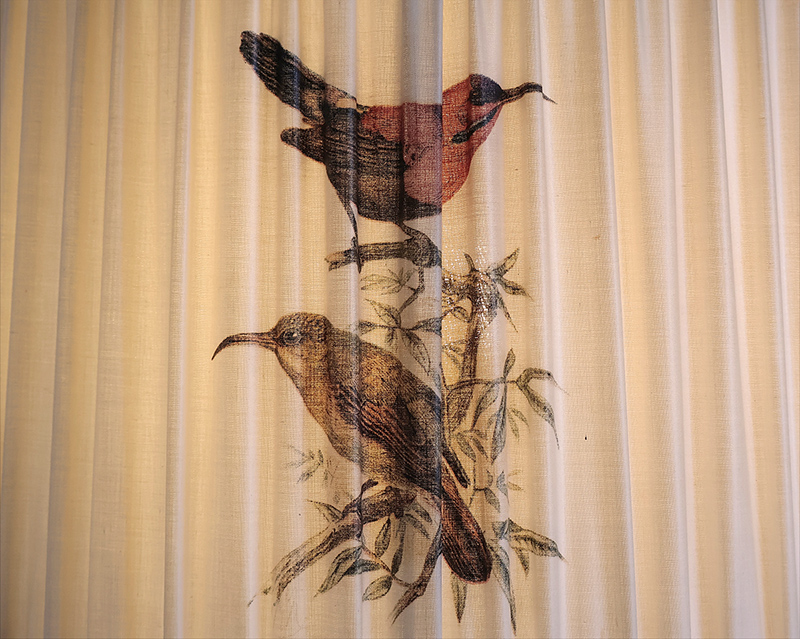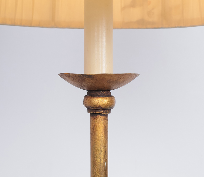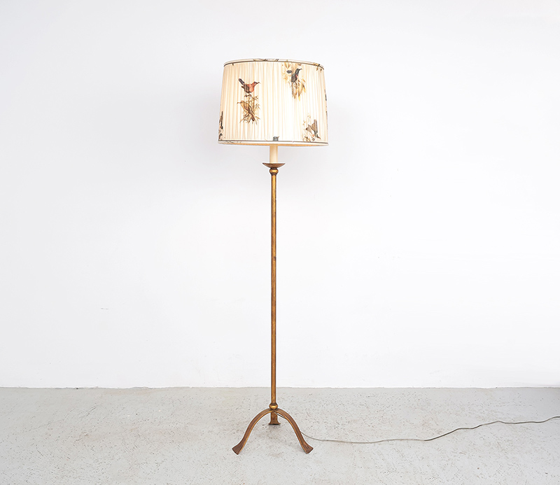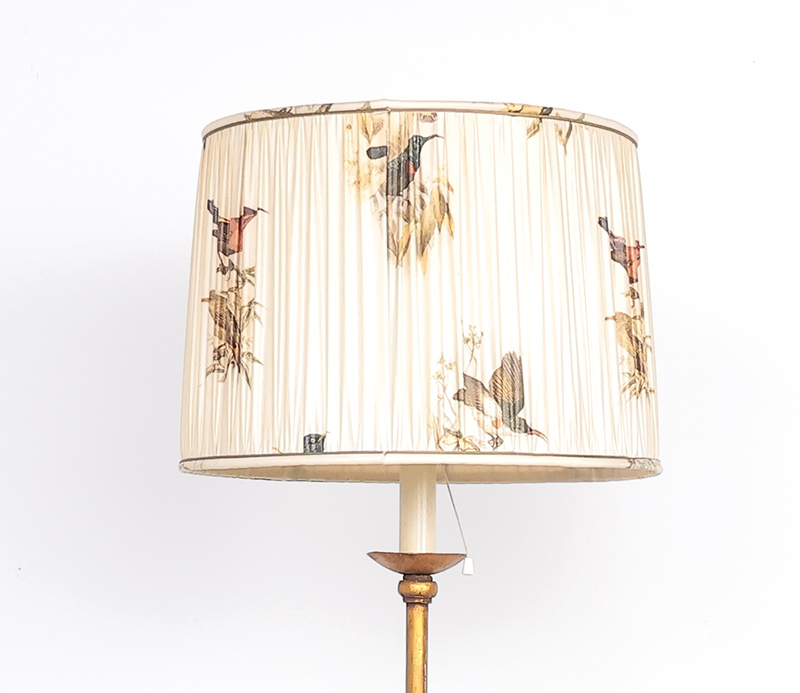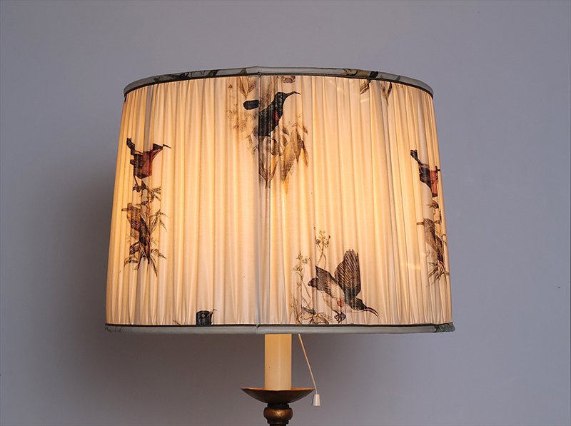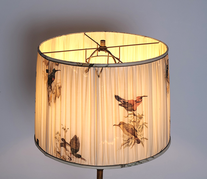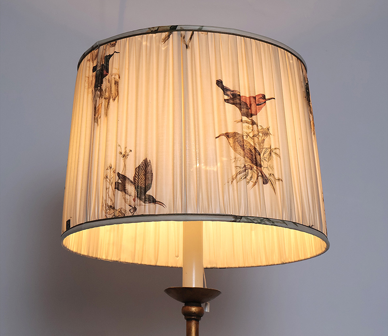 De lamp heeft een een verguld metalen driepoot frame en een stoffen kap met vogeldecor. De lichtbron wordt geplaatst in een kaarsfitting met trekkoord, wat de lamp eenvoudig in gebruik maakt.