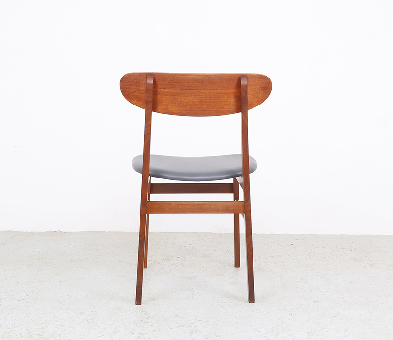 De zittingen zijn opnieuw bekleed met nieuw grijs skai, wat mooi combineert met het warme teakhout en de stoelen weer helemaal klaar maakt voor jarenlang gebruik.