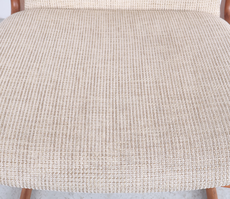 De zittingen en rugleuningen zijn bekleed met een zachte, gemêleerde ecru stof, waarbij de rugleuning is afgewerkt met vier decoratieve knopen voor een stijlvolle en verfijnde uitstraling. De stoelen passen in een moderne als vintage interieurs.