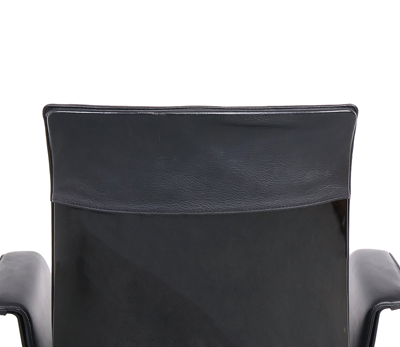 De stoel heeft een hard, zwart gepolijste kunststof zitschelp die is voorzien van een hoogwaardige leren bekleding. Het onderstel bestaat uit een zwart gelakt metalen driepoot, wat zorgt voor een stabiele basis en een lichte, moderne uitstraling. Dit betreft de variant met lage rugleuning, wat de stoel een subtiele en minimalistische look geeft.