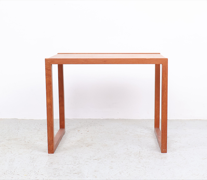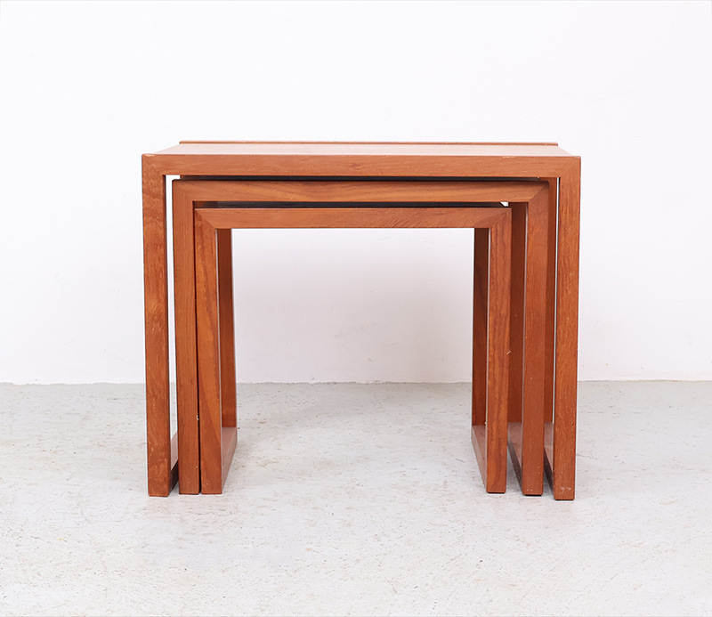 De nest tafeltjes, ook wel mimiset genoemd, zijn uitgevoerd in warm teak en teak fineer en kenmerken zich door een strak, rank ontwerp met elegant doorlopende poten.